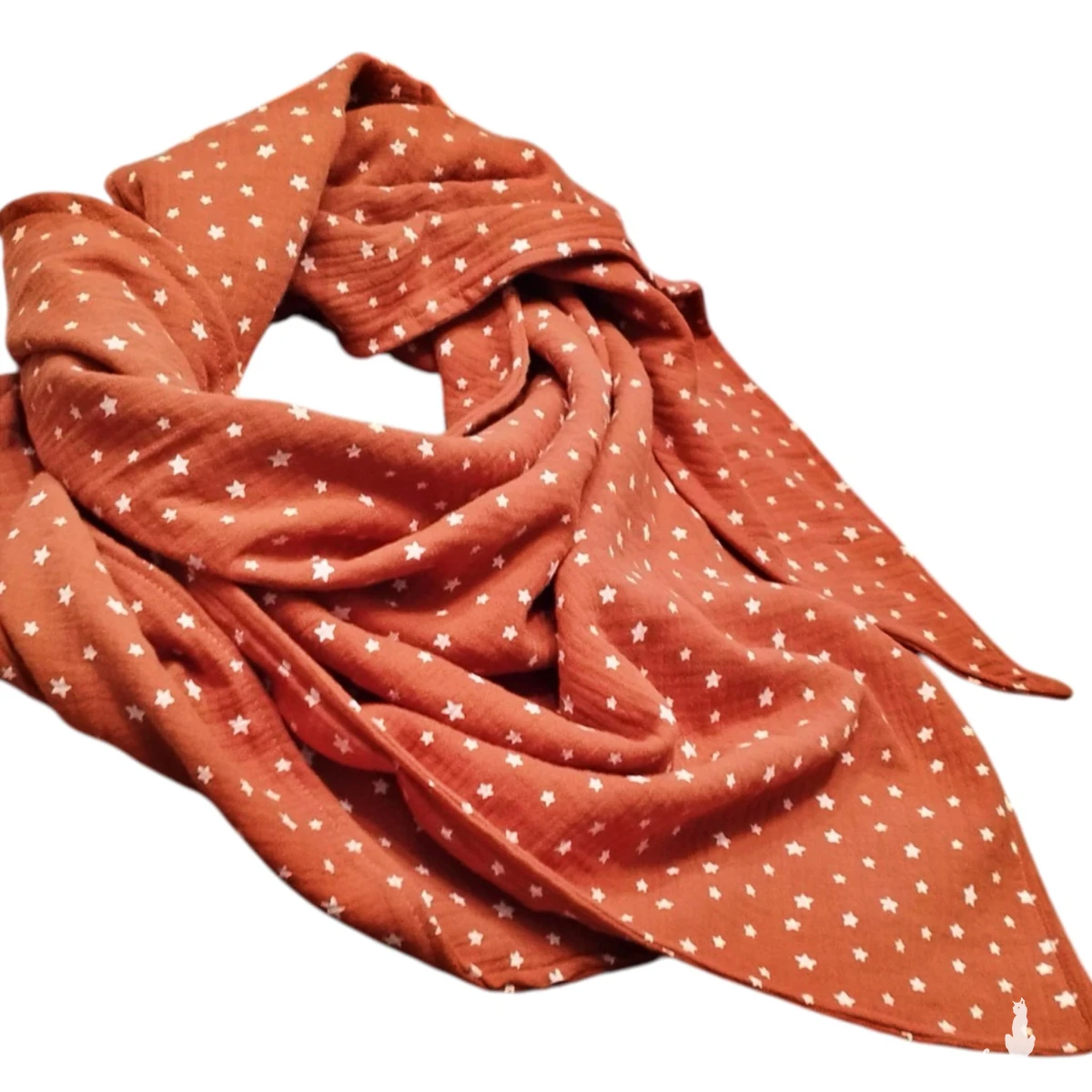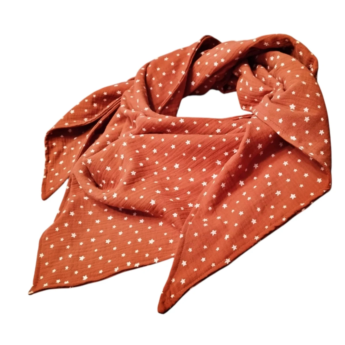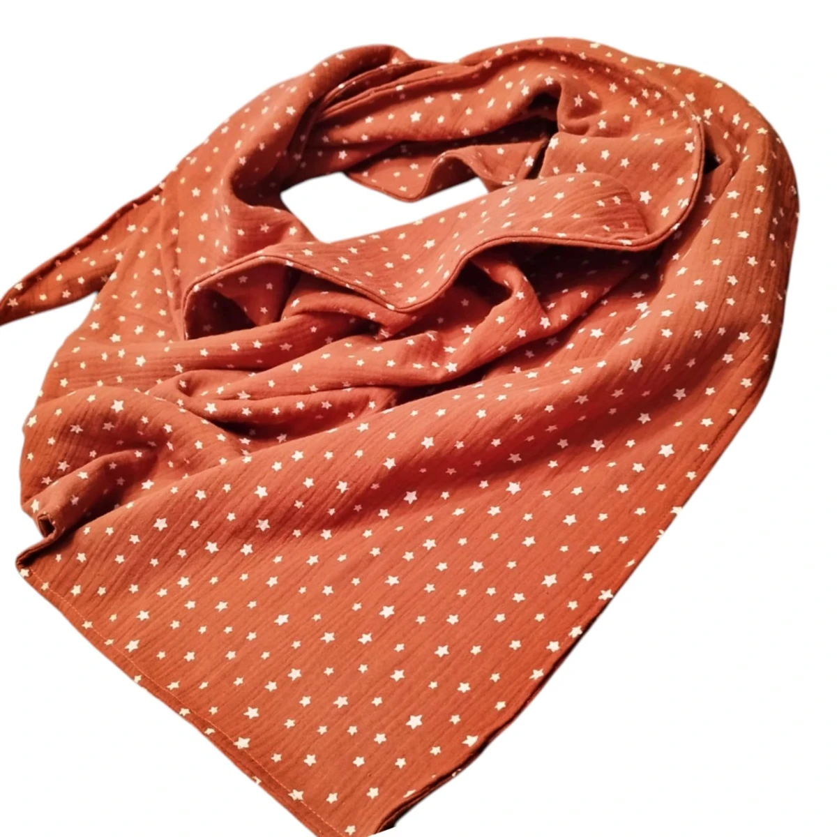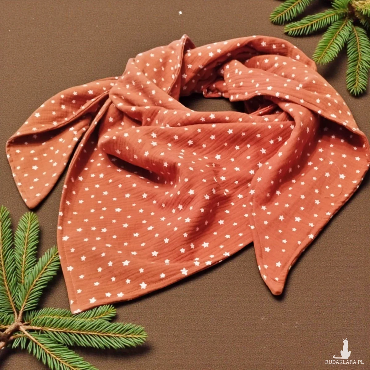 Ciepła damska bawełniana chusta uszyta z bawełnianego muślinu. Chusta uszyta z dwóch kawałków bawełnianego muślinu w rdzawym kolorze w białe gwiazdki. Jest miękka i przyjemna w dotyku.