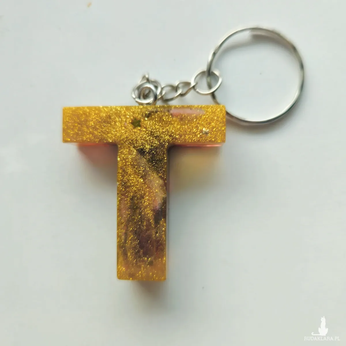 Brelok literka T bursztynowa złota z kolorowym maziajem