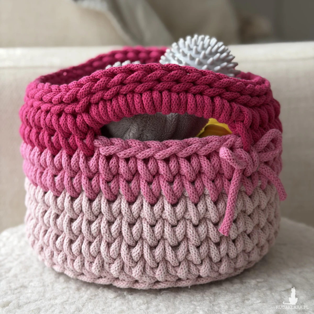 Jedyny w swoim rodzaju, ręcznie pleciony koszyk ze sznurka bawełnianego w różowych odcieniach – od najdelikatniejszego jasnego po głęboki róż. Średnica 23 cm, wysokość 15 cm. Wyposażony w wygodne uszy.