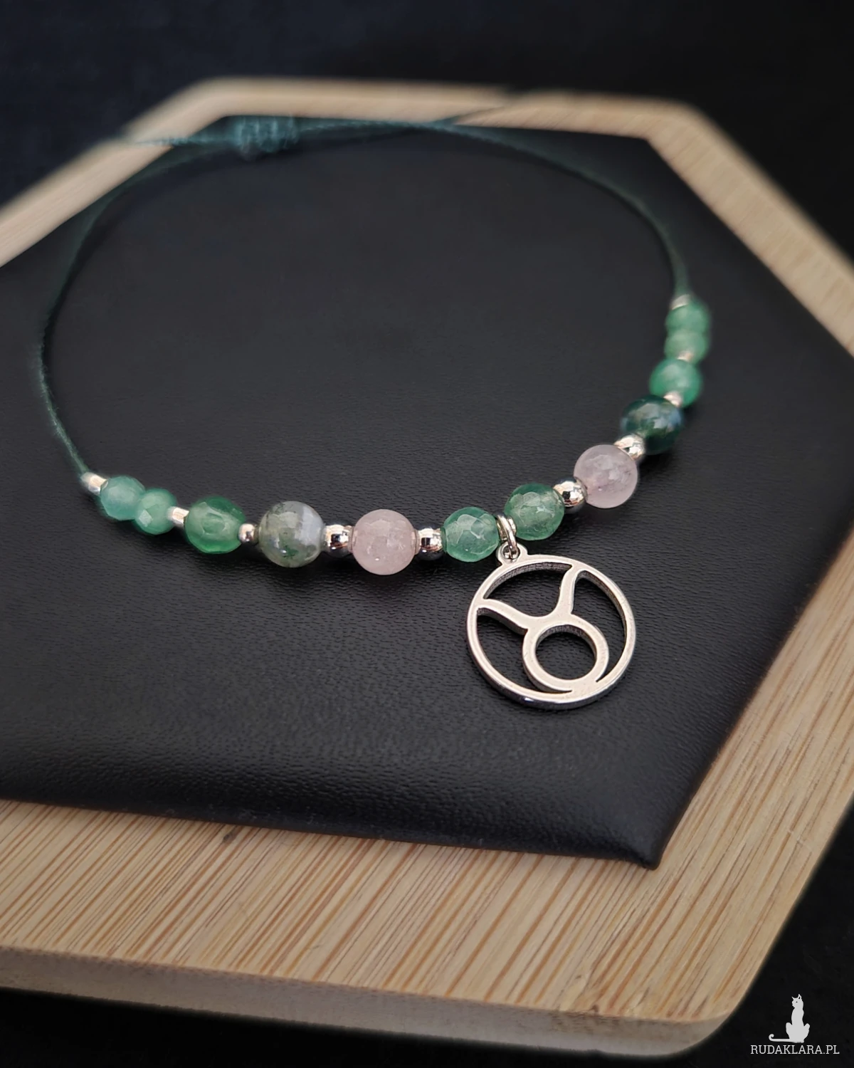 Bransoletka Zodiakalna „Byk” to harmonijna, ciepła kompozycja stworzona z myślą o osobach urodzonych pod znakiem Byka — stabilnych, lojalnych, ceniących bezpieczeństwo, bliskość natury i komfort życia. Zielone odcienie kamieni przełamane delikatnym różem oraz srebrnymi akcentami tworzą elegancką, spokojną całość, która odzwierciedla ziemski charakter Byka. Srebrna zawieszka z symbolem znaku podkreśla indywidualność bransoletki, czyniąc ją osobistym talizmanem równowagi i obfitości.