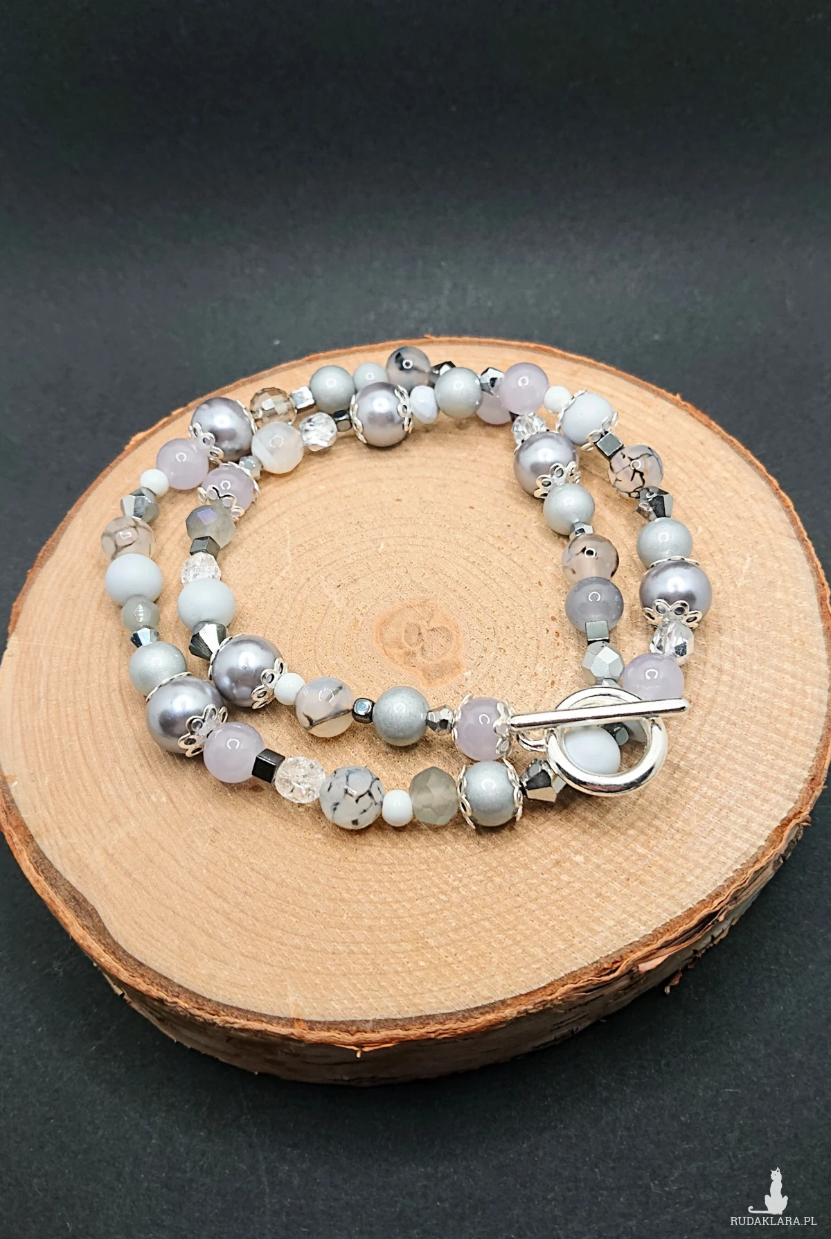 Naszyjnik wykonany z szklanych koralików, kamieni ozdobnych oraz metalowych elementów. Kolorystyka w odcieniach koloru szarego z srebrnymi dodatkami.