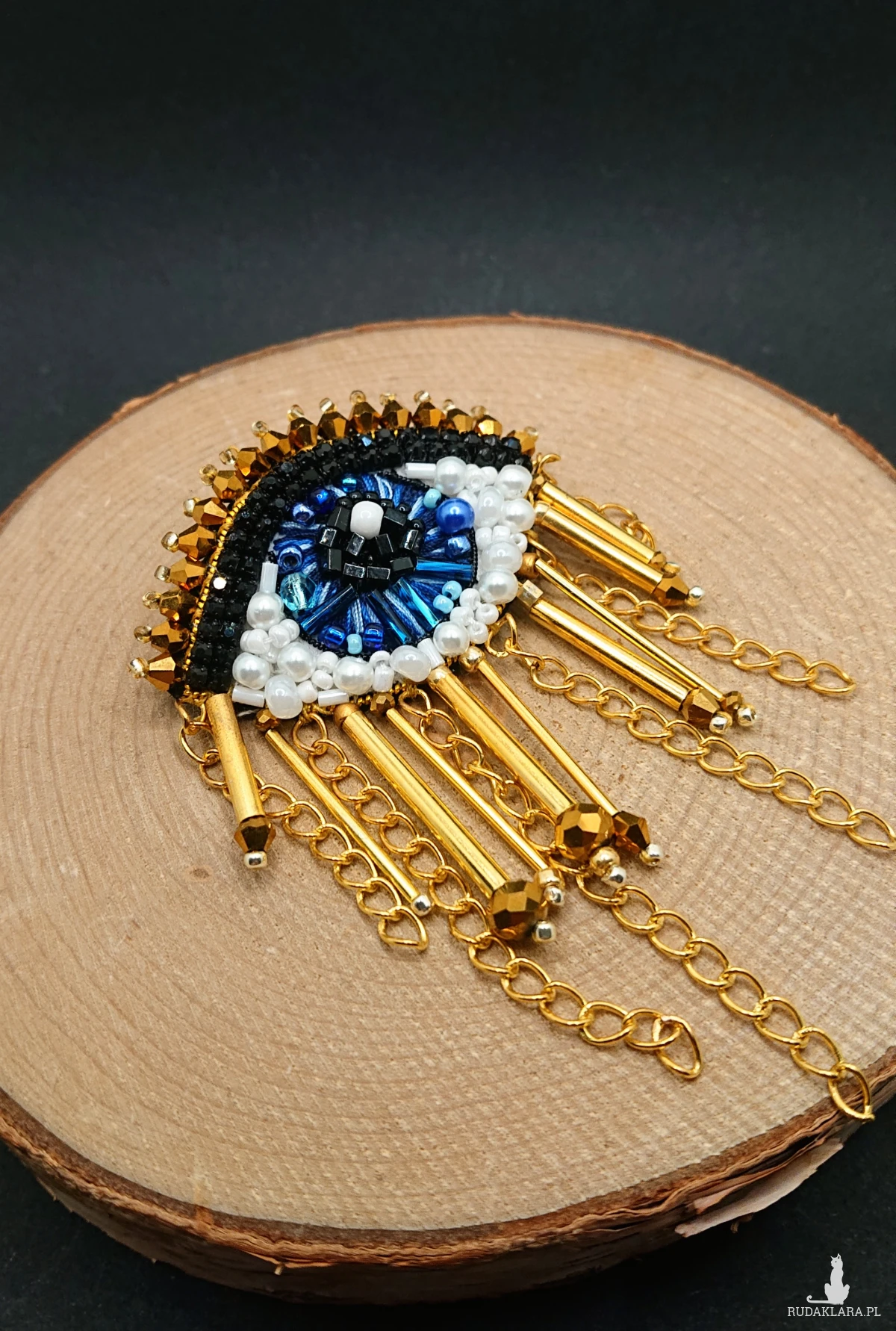 Broszka w kształcie niebieskiego oka z złotymi elementami. Wykonana z szklanych koralików o różnych kształtach i wielkościach, taśmy z cyrkoniami oraz niewielkich szklanych koralików. Dół broszki ozdobiony metalowymi łańcuszkami i rurkami o różnych rozmiarach.
