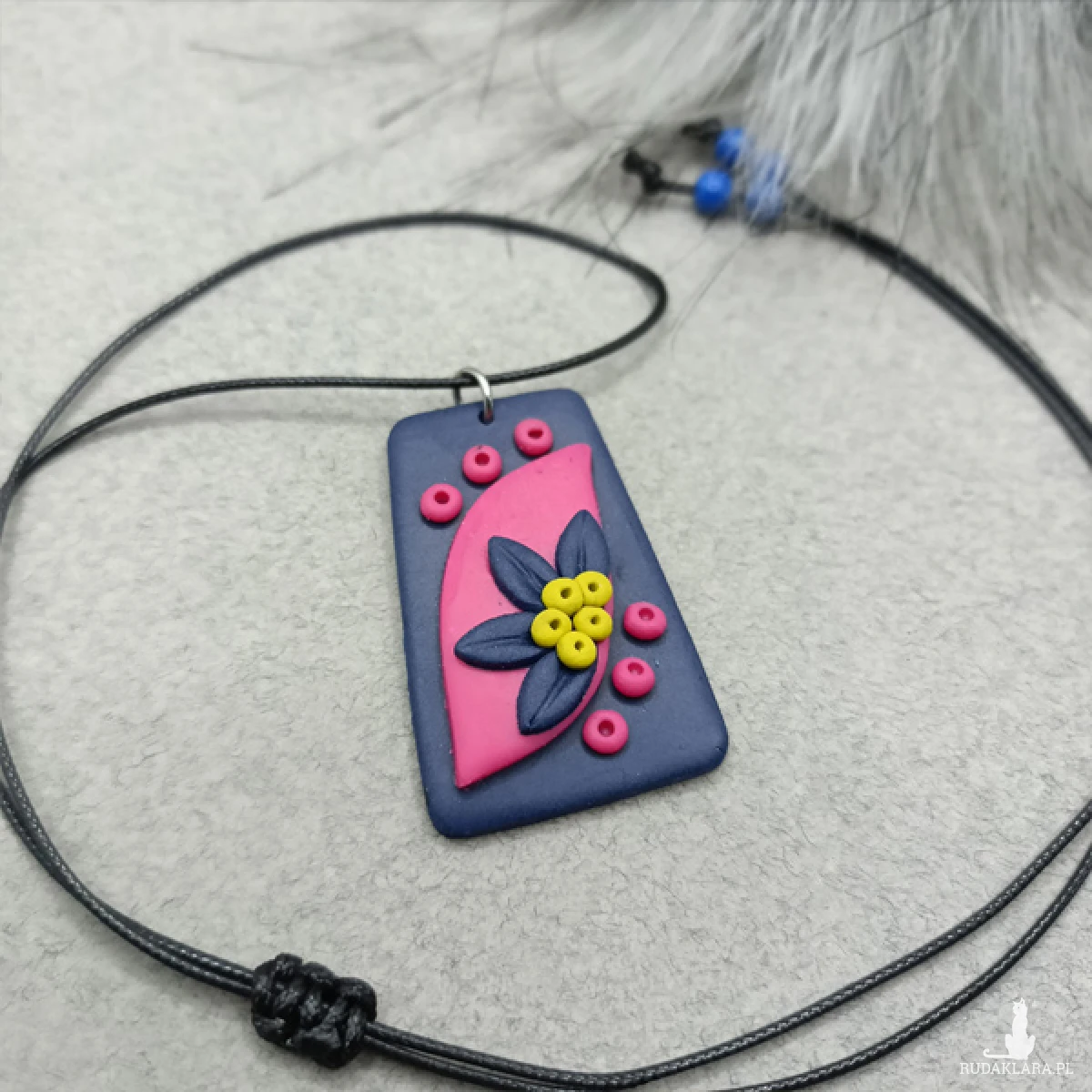 Wisiorek jest w kolorze granatowym i różowym, zawieszony na sznurku jubilerskim.