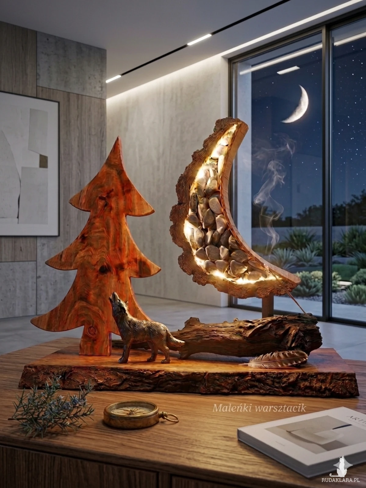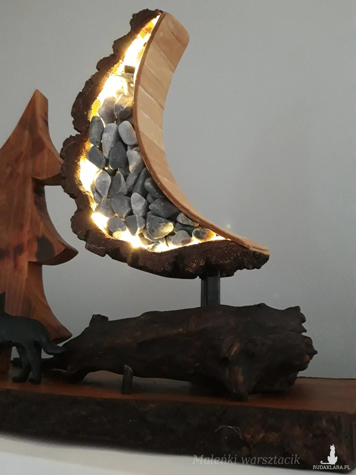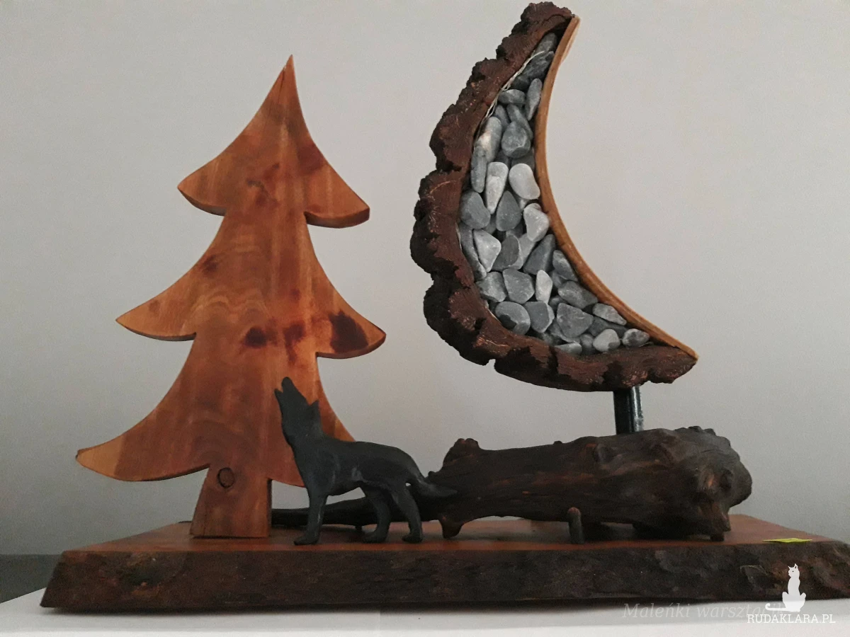 Materiał: drewno drzewa owocowego -czereśnia, kora brzozy, kamienie w niebieskim odcieniu, księżyc podświetlany lampkami led.