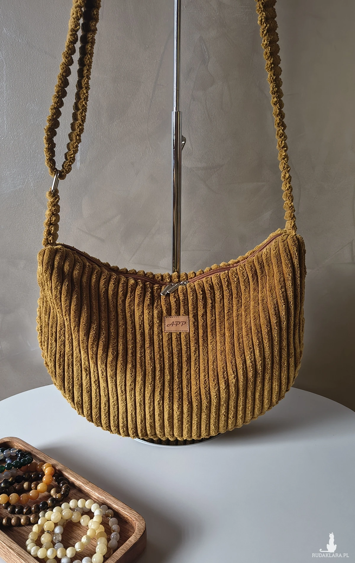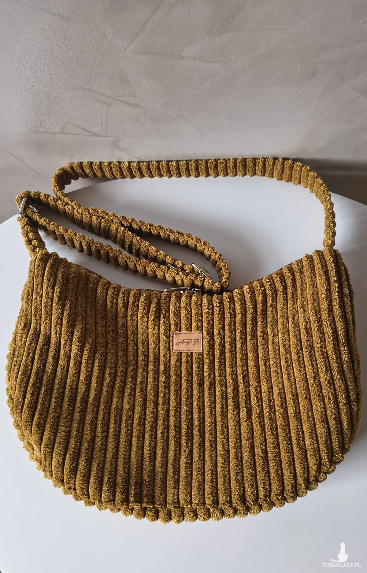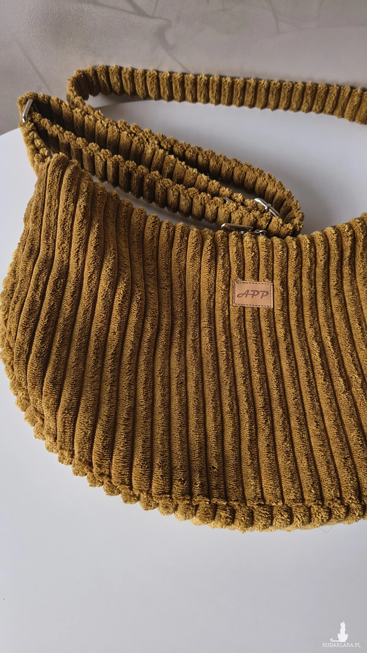 Powstała że sztruksu tapicerskiego, co gwarantuje jej wytrzymałość i długie użytkowanie. Wewnątrz znajduje się wodoodporna podszewka z kieszonką na zamek. Pasek regulowany również wykonany ze sztruksu, a więc delikatny dla naszego ciała. Torbę można nosić na ramieniu lub przez ramię. Okucia srebrne, niklowane.