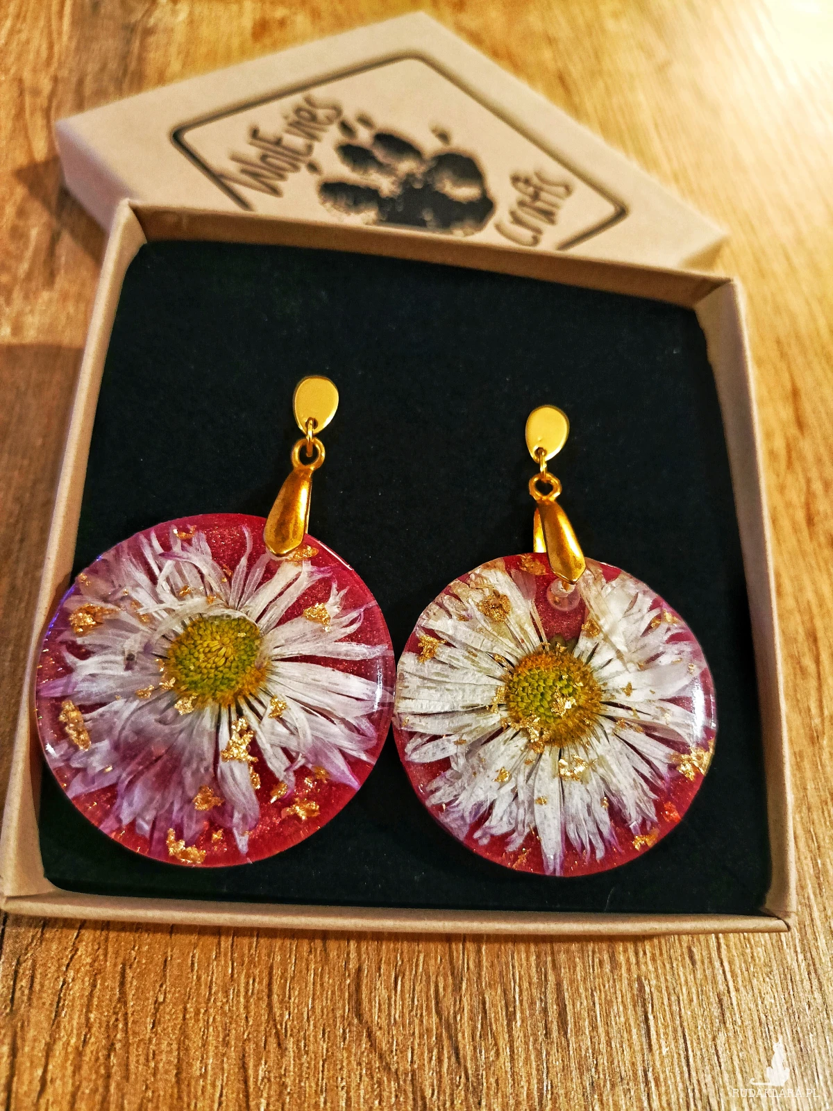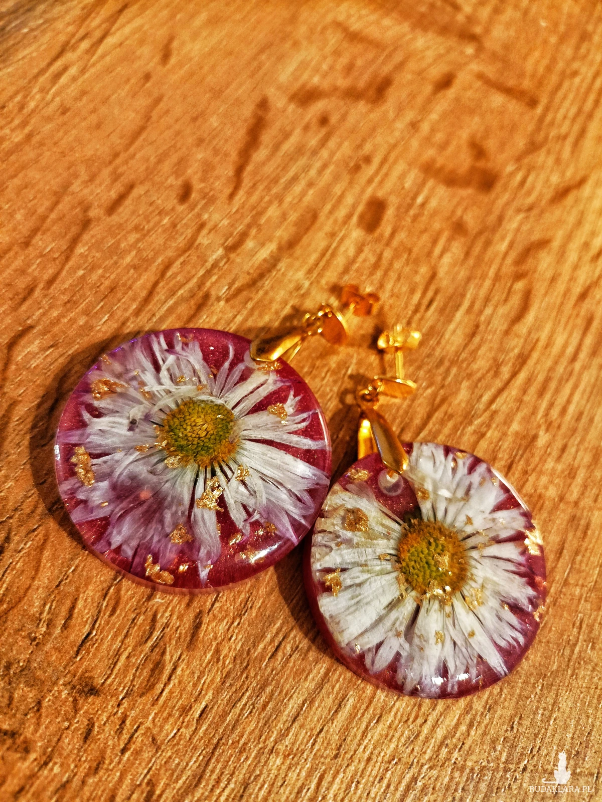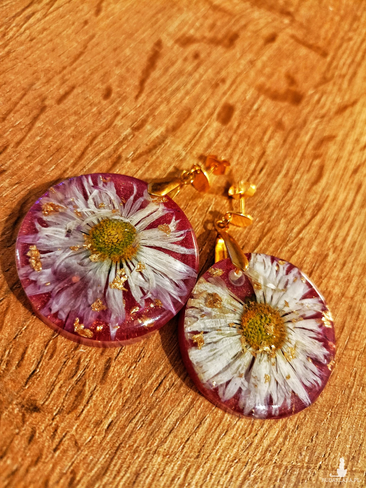 kolczyki handmade, kolczyki z żywicy, kolczyki z kwiatami, stokrotka biżuteria, kolczyki wiszące duże, resin pro jewelry, kolczyki na dzień babci, prezent dla babci, biżuteria z suszonymi kwiatami, kolczyki boho, eleganckie kolczyki, stal nierdzewna pozłacana