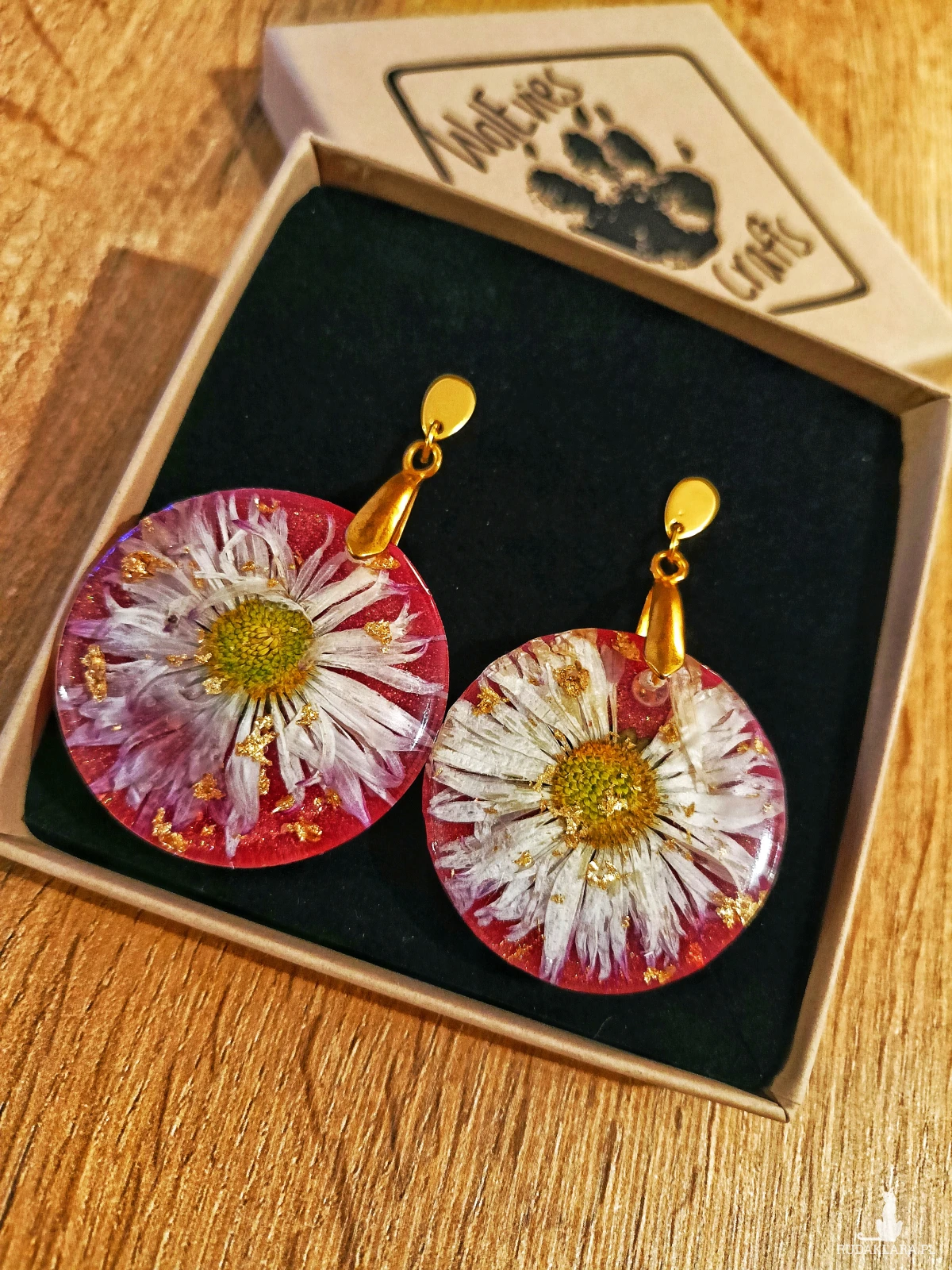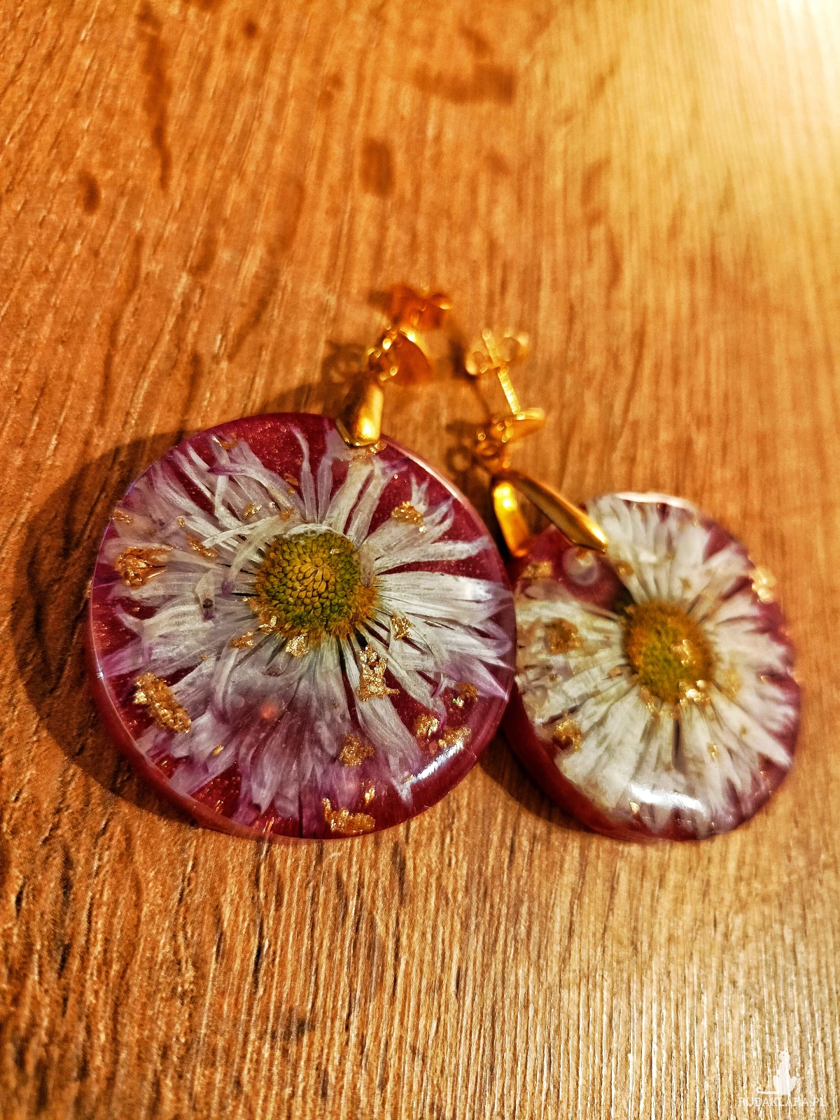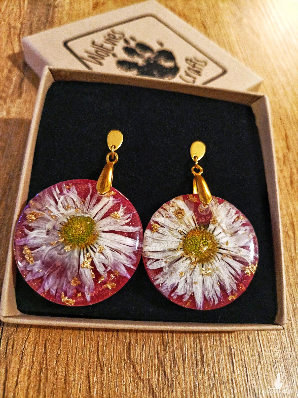 kolczyki handmade, kolczyki z żywicy, kolczyki z kwiatami, stokrotka biżuteria, kolczyki wiszące duże, resin pro jewelry, kolczyki na dzień babci, prezent dla babci, biżuteria z suszonymi kwiatami, kolczyki boho, eleganckie kolczyki, stal nierdzewna pozłacana