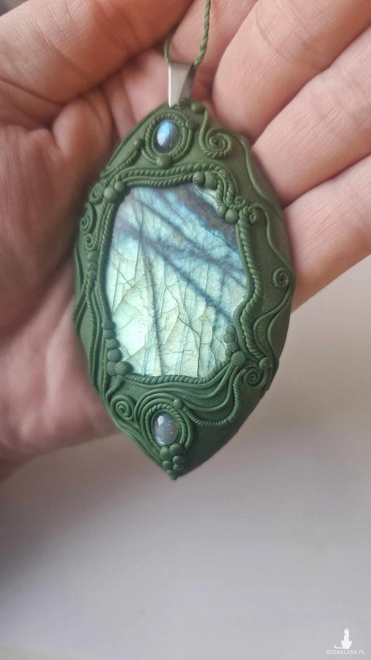 Główny kamień to szlifowany plaster labradorytu, a pozostałe dwa to małe kaboszony z labradorytu. Tło wisiora bardzo lekko połyskuje/opalizuje. Wisiorek jest na sznurku o długości około 45 cm.