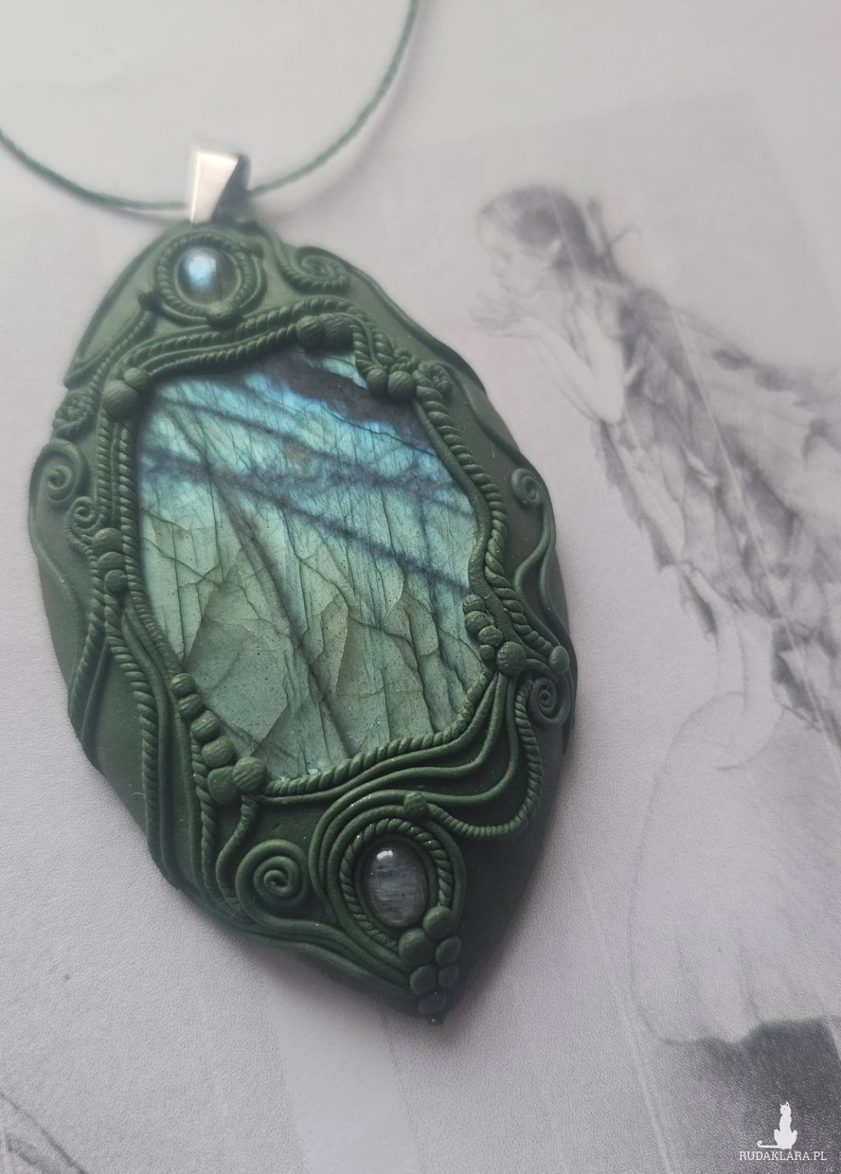 Wisior/naszyjnik/amulet/talizman wykonany misternie z gliny polimerowej. Ozdobiony filigranami, wzorami nawiązującymi do roślinnych pnączy, elfów czy do wzorów orientalnych.