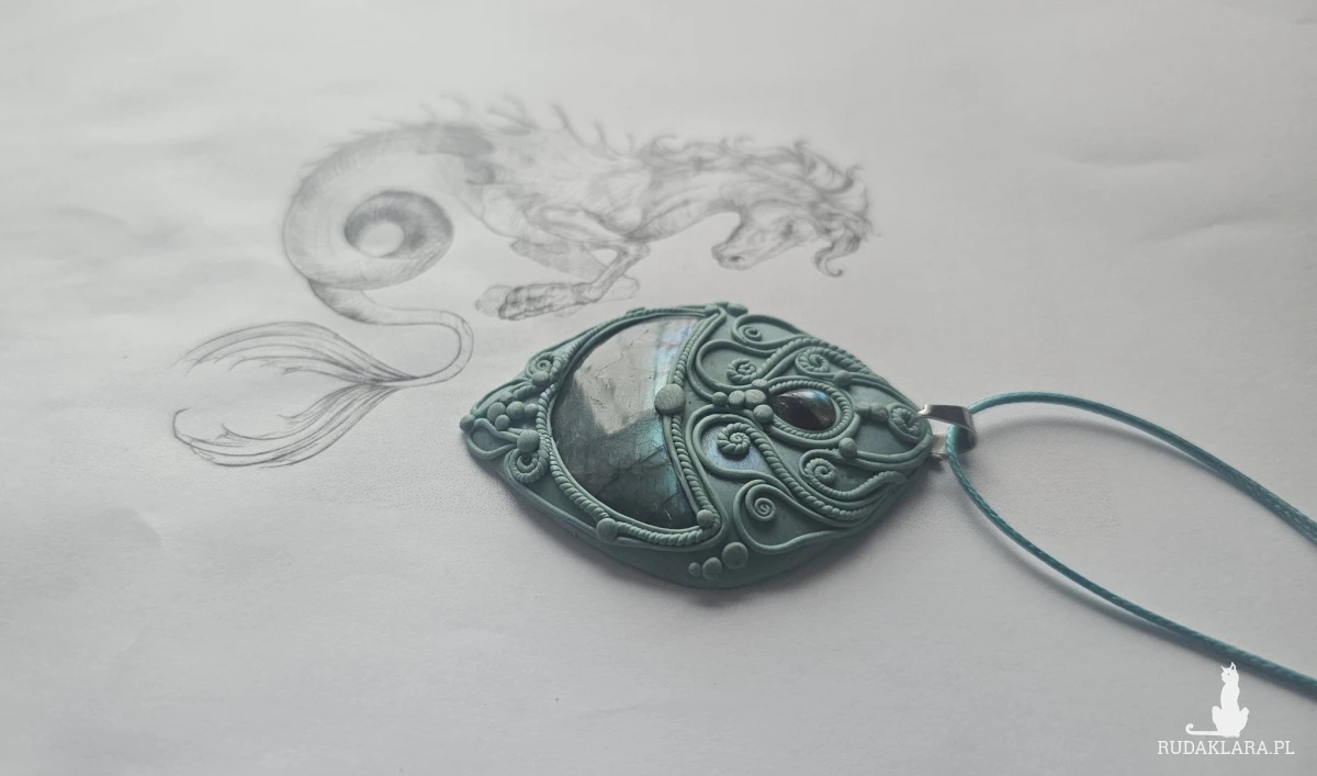 Wisior/naszyjnik/amulet/talizman wykonany misternie z gliny polimerowej. Ozdobiony filigranami, wzorami nawiązującymi do pnączy, elfów czy do wzorów orientalnych.