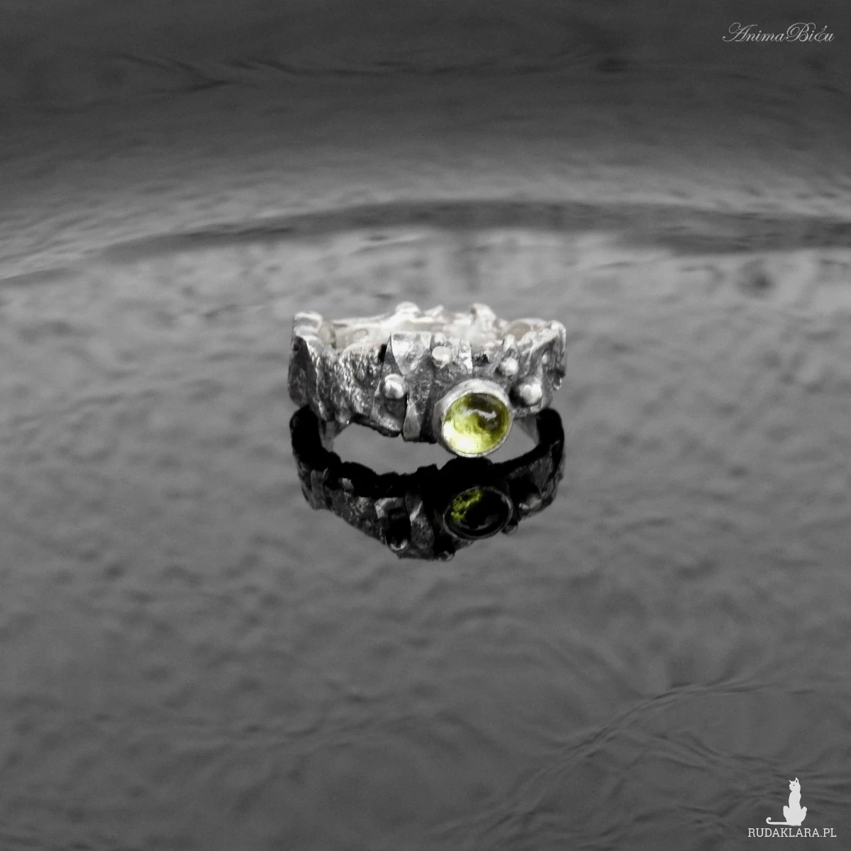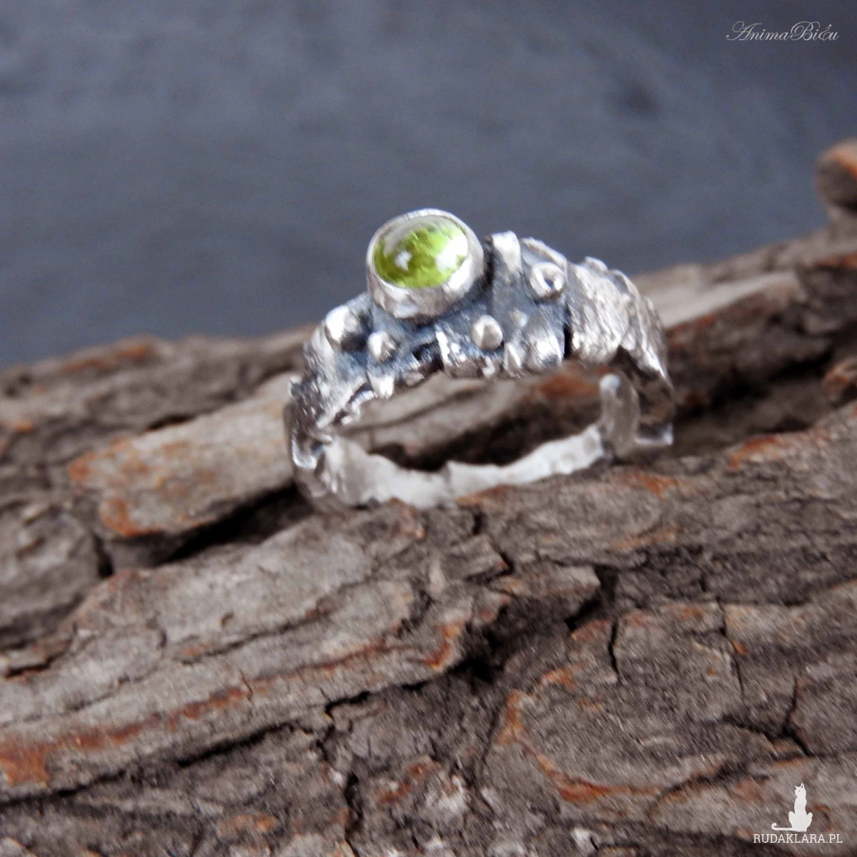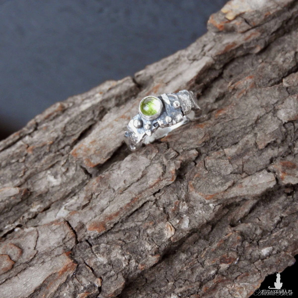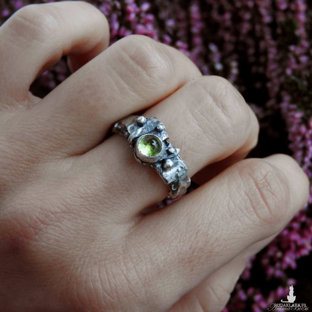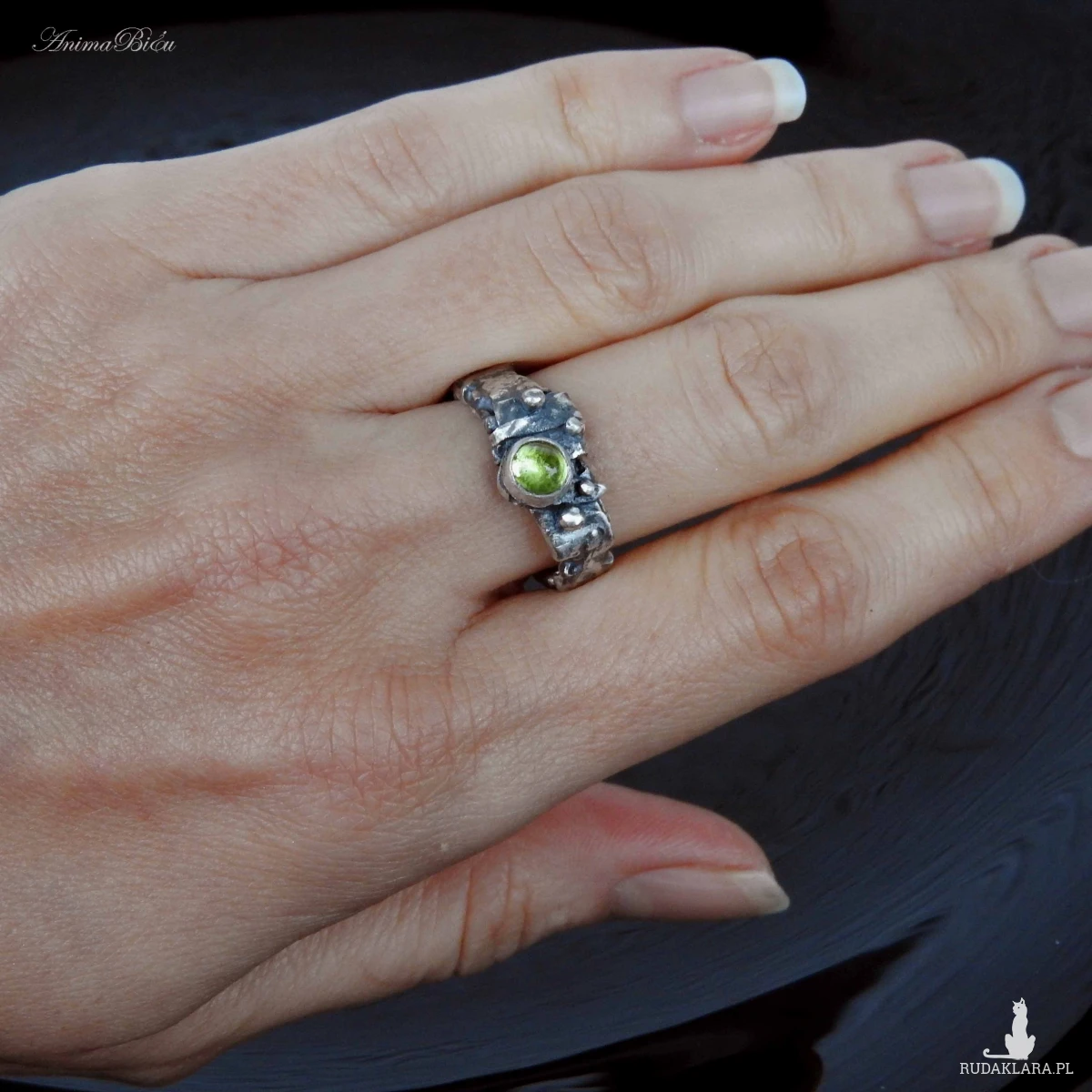 Obrączka srebrna z oliwinem. Wykonana od podstaw ręcznie powstała z przetapianego srebra próby 925, które mocno przyciemniłam i miejscami wypolerowałam. Charakter pierścionka jest bardzo surowy, srebro ma nieregularną fakturę, obręcz ma różną szerokość, przy koronie jest nieco szersza. Doskonałym akcentem jest kontrastujący z surowością wyrobu minerał o jasnozielonym odcieniu, czyli uroczy oliwin. Rozmiar jubilerski obrączki wynosi 13 i jest on stały, bez możliwości regulacji. Cechowany w Urzędzie Probierczym. Waga obrączki: 5,7g.