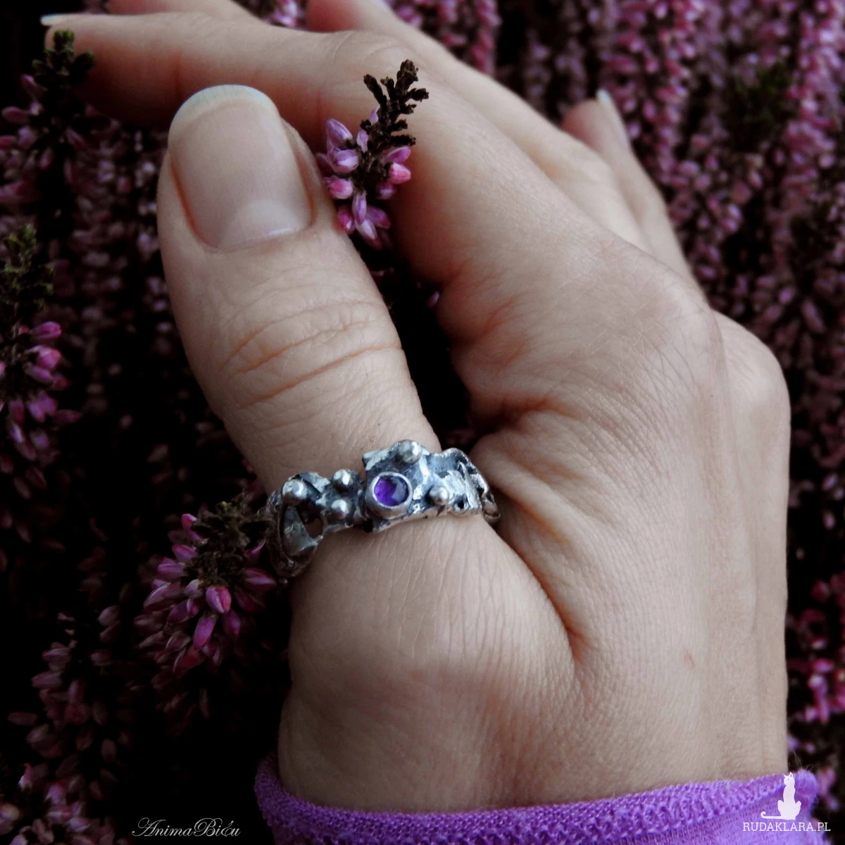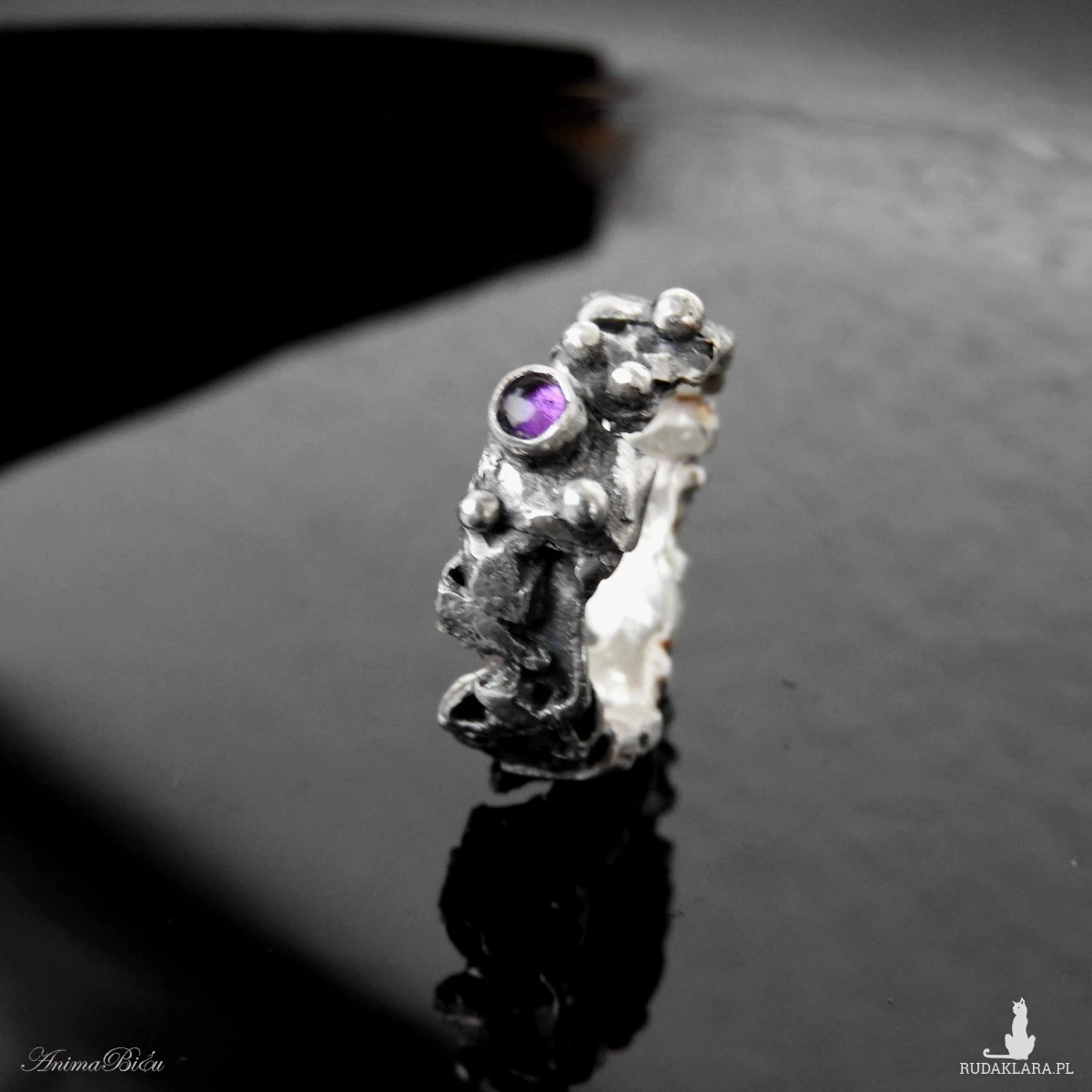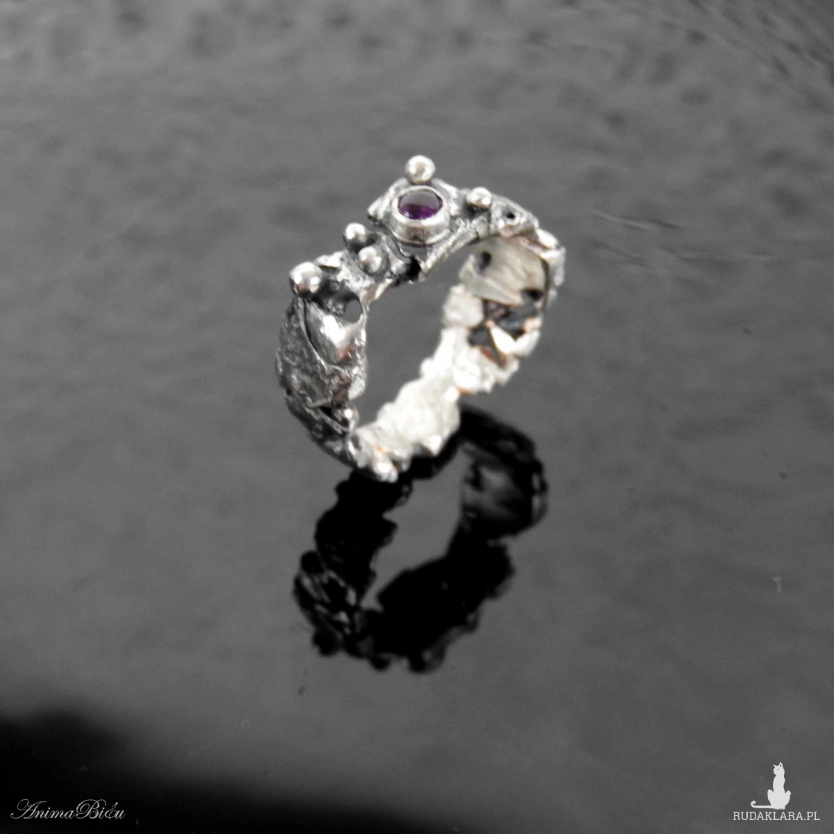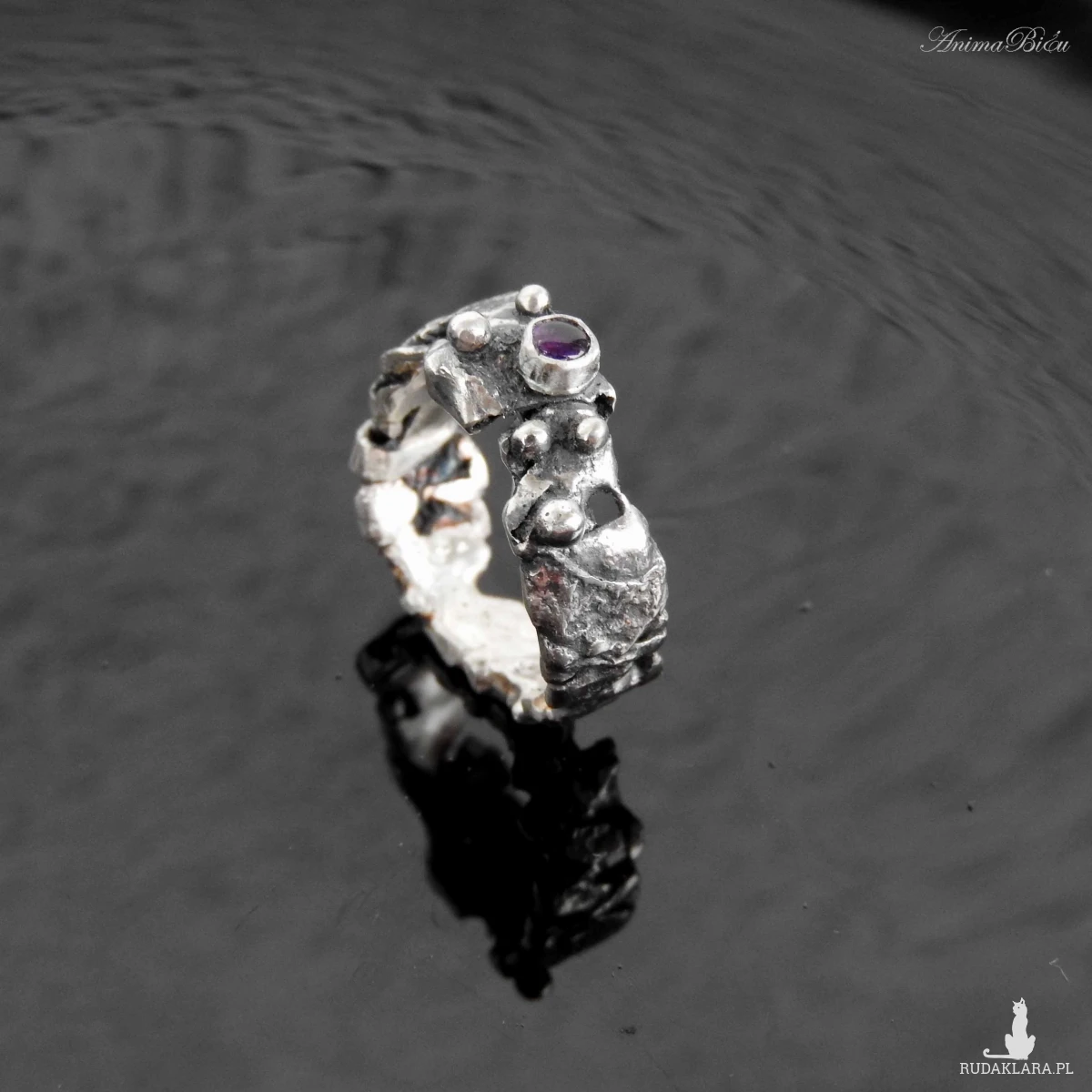 Obrączka srebrna z ametystem. Wykonana od podstaw ręcznie