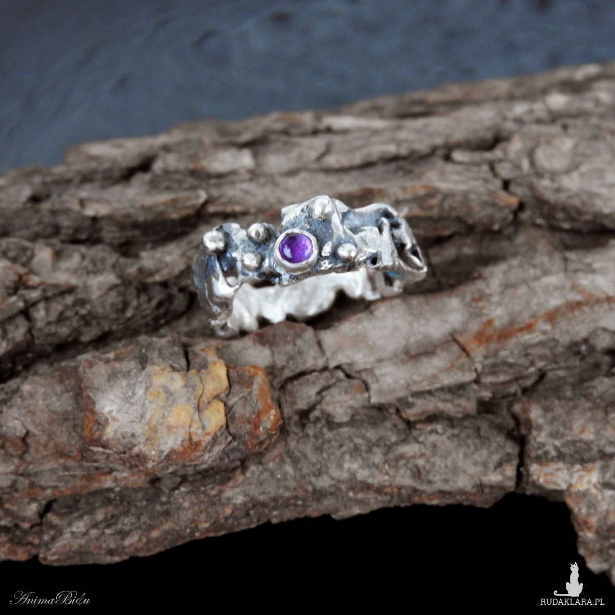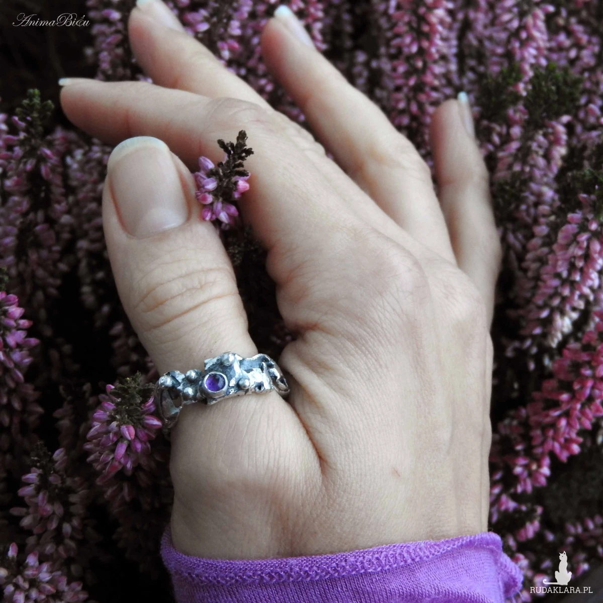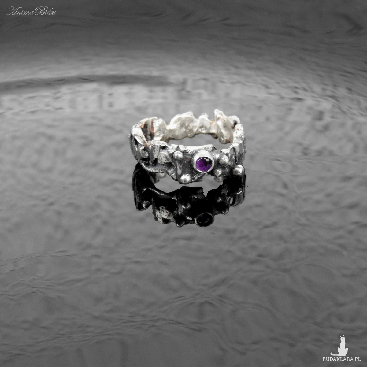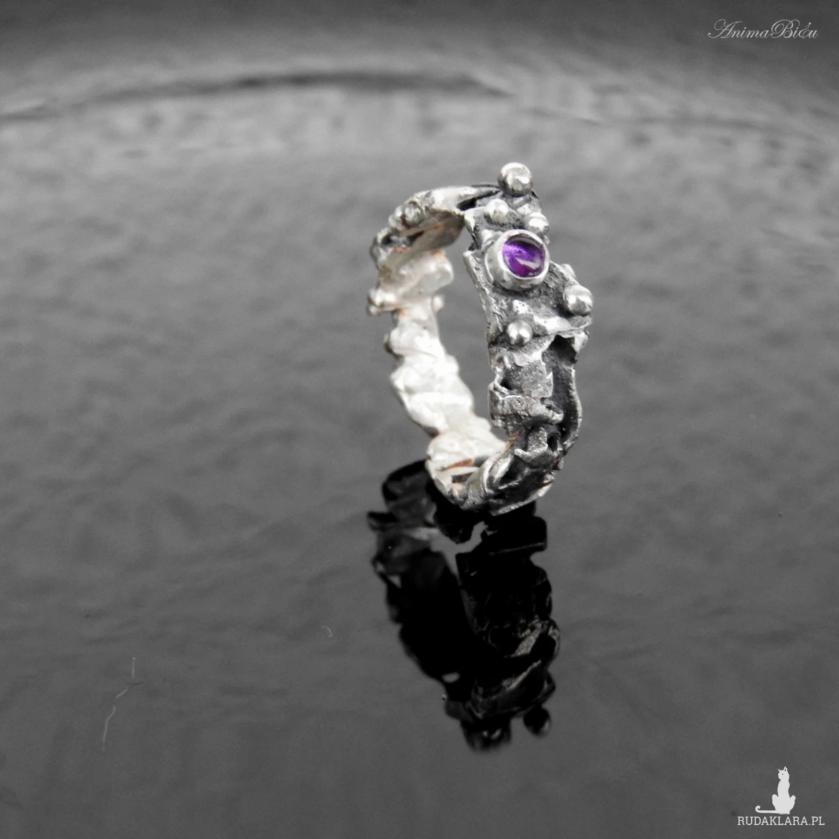 Obrączka srebrna z ametystem. Wykonana od podstaw ręcznie