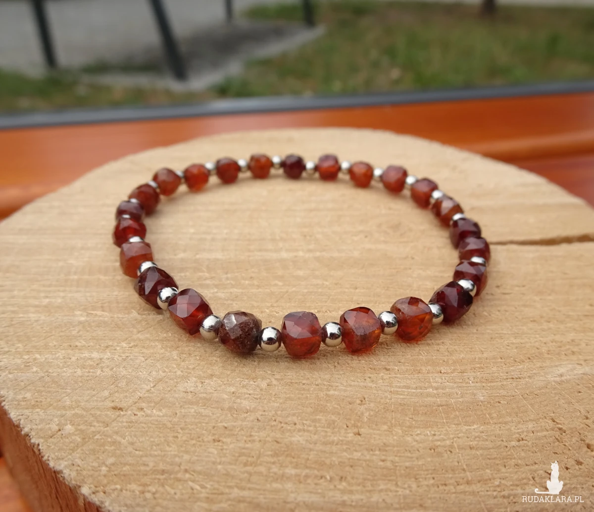 Bransoletka z hessonitu (pomarańczowej odmiany granatu) i kulek ze stali szlachetnej, na silikonowej gumce