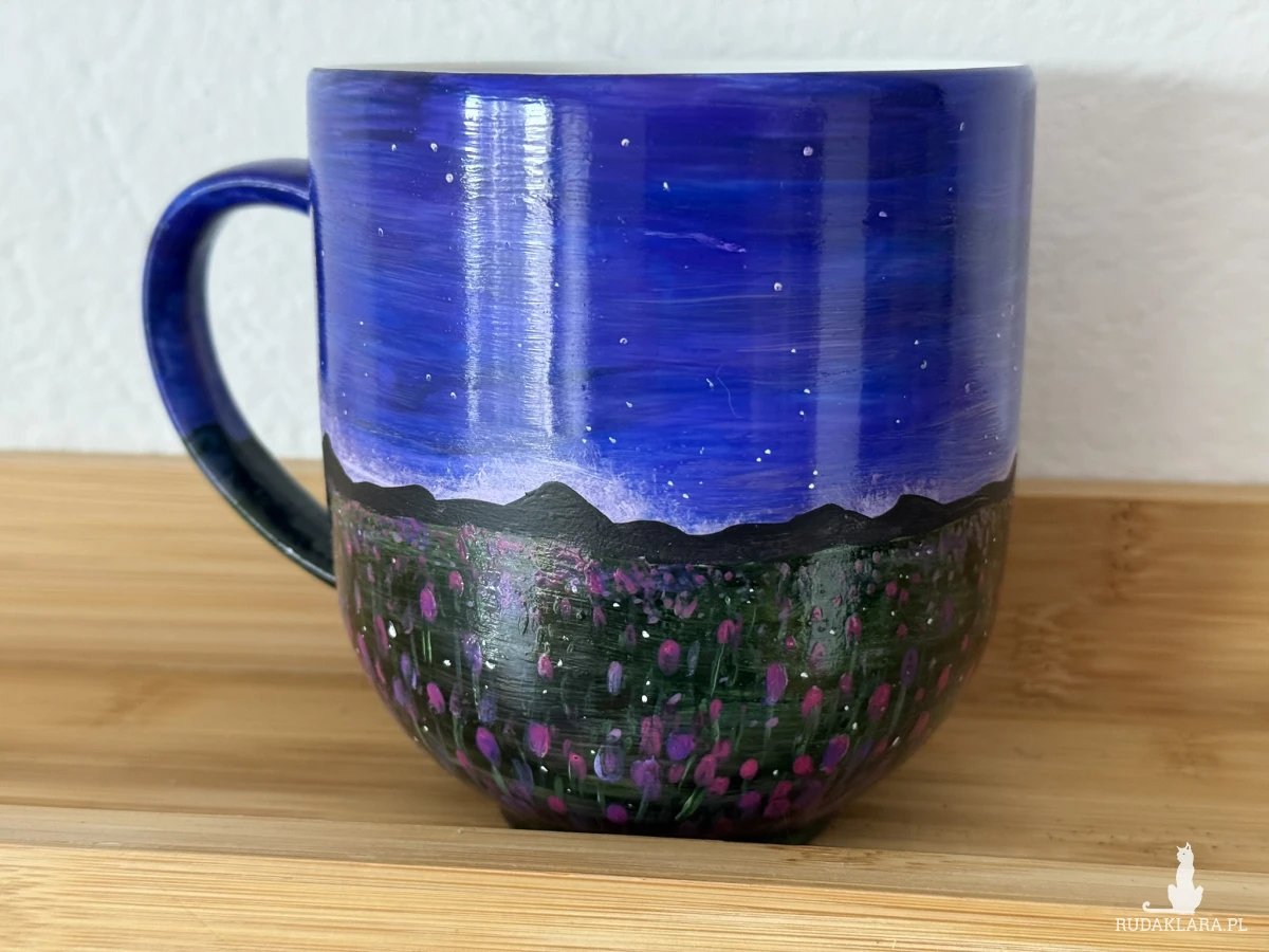 Ręcznie malowany kubek z motywem nocnego krajobrazu górskiego. Jest on wykonany przy użyciu wysokiej jakości farb porcelanowych i wypalony w wysokiej temperaturze. Kubek jest wykonany z porcelany i ma pojemność 550 ml.