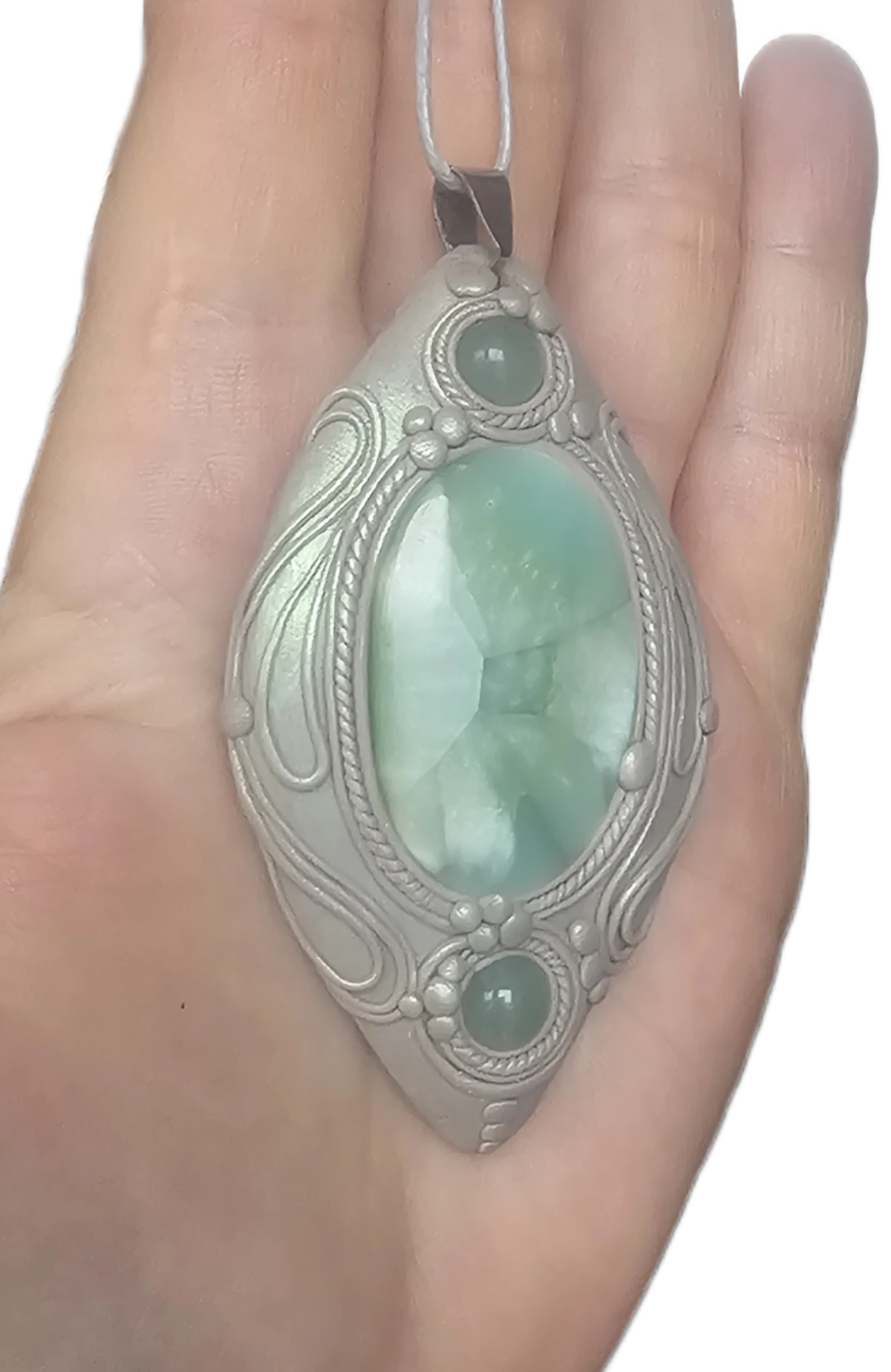 Główny kamień to kaboszon - hemimorfit, kamień z głębią, której piękno ciężko ukazać na zdjęciach. Jakby trójwymiarowy, trochę jakby perłowy w środku. Dwa pozostałe małe kaboszony to akwamaryny. Tło wisiora bardzo lekko połyskuje/opalizuje na zielono. Wisiorek jest na sznurku o długości około 45 cm.