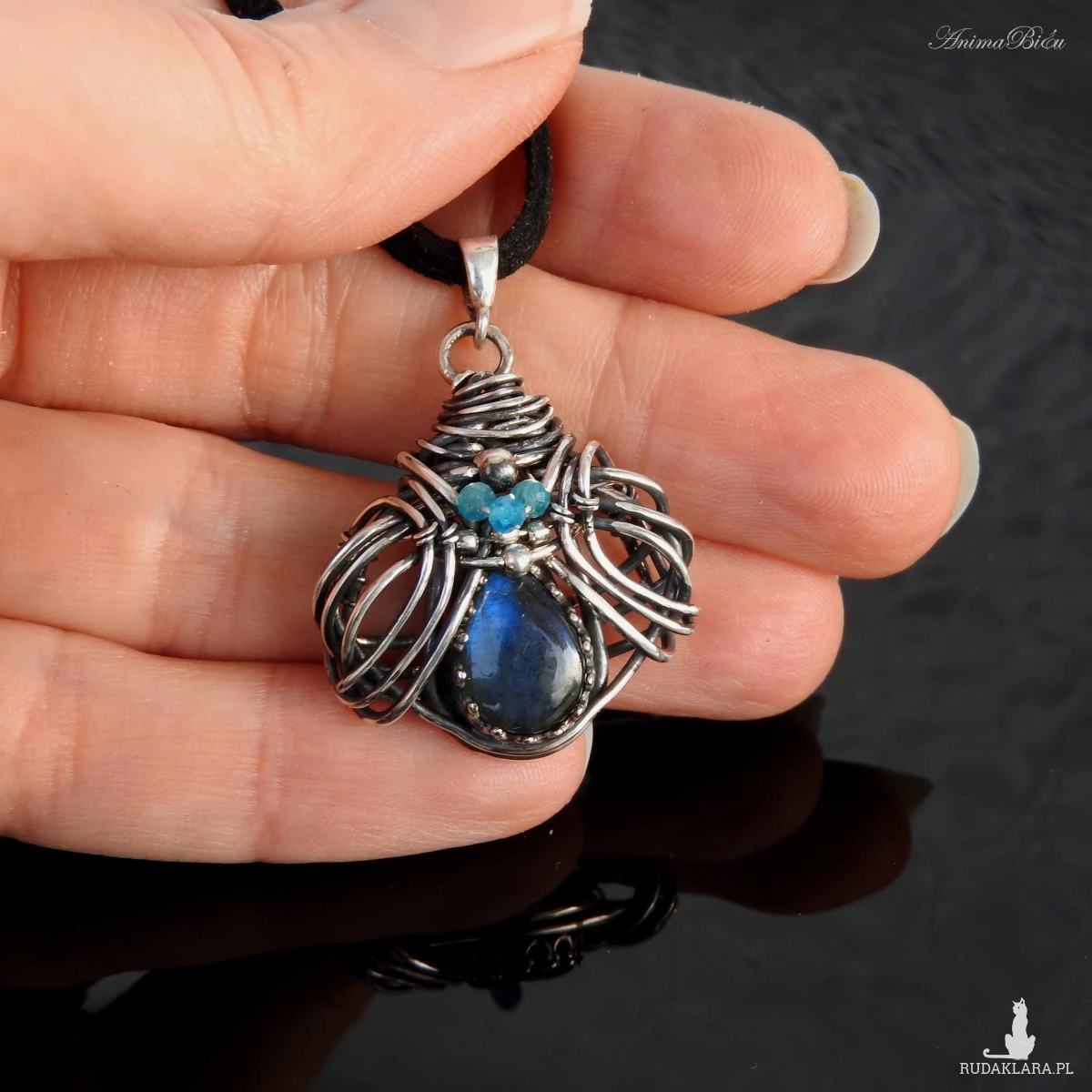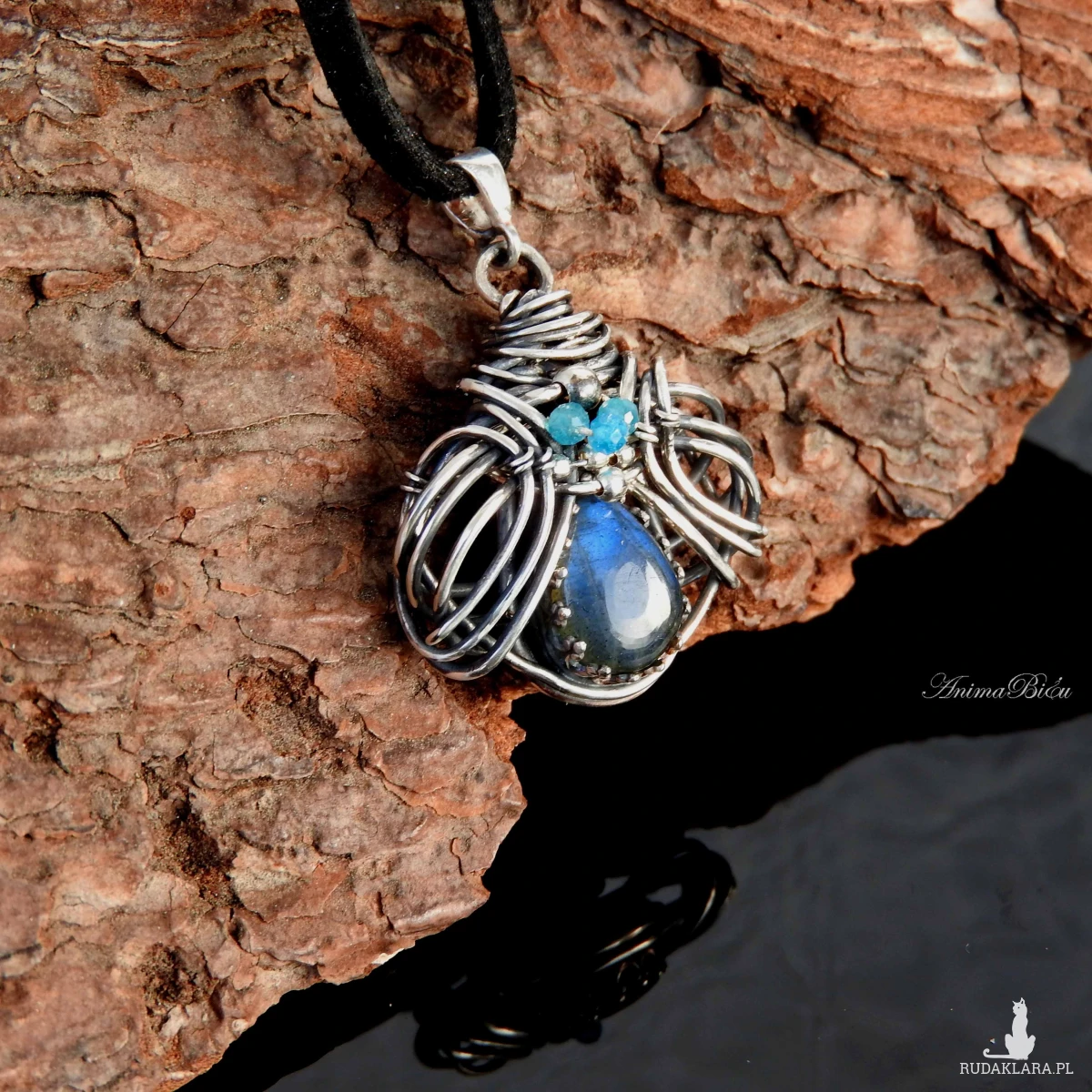 kropelka labradorytu o niebieskiej iryzacji. Oprawiłam ją w srebrną koronkę,
