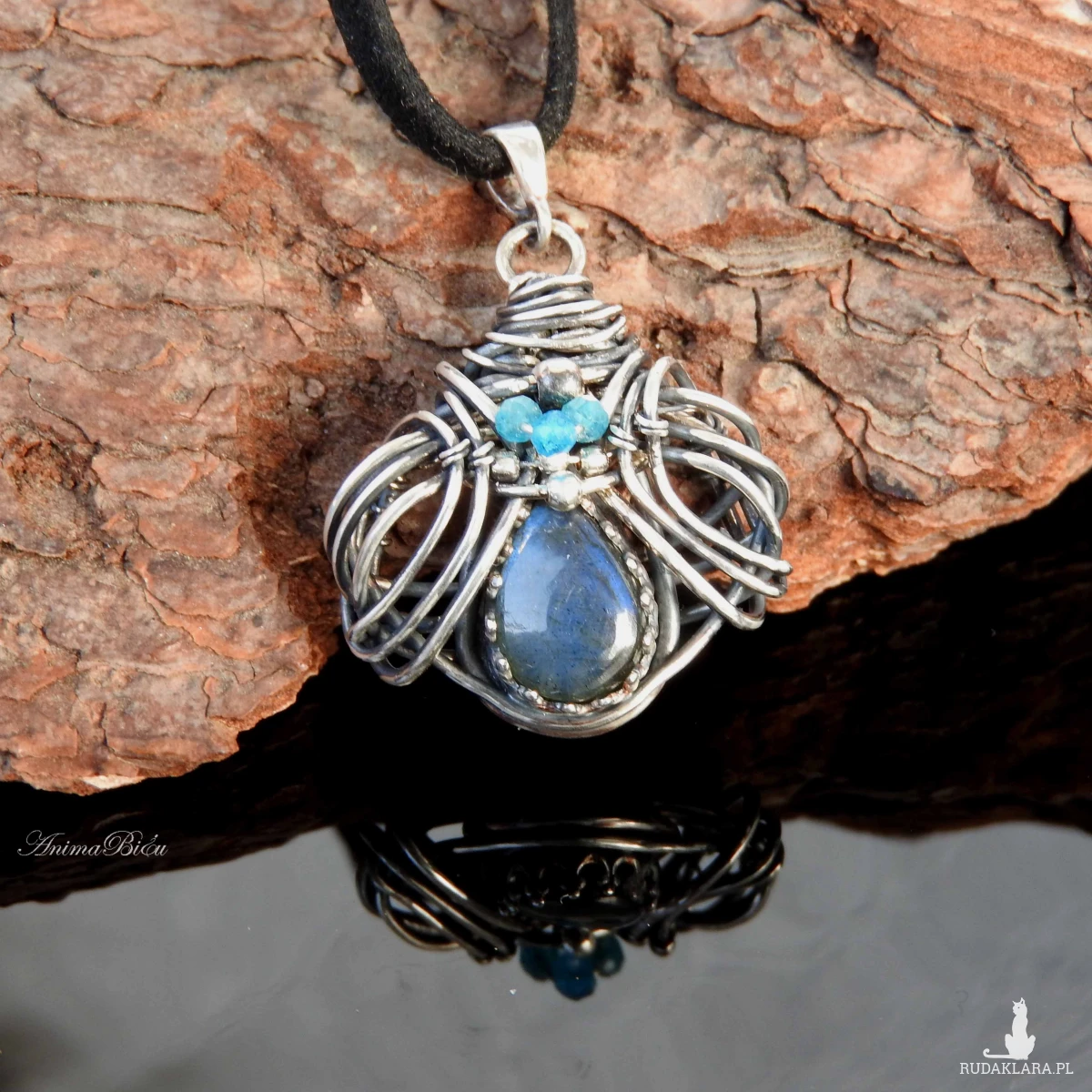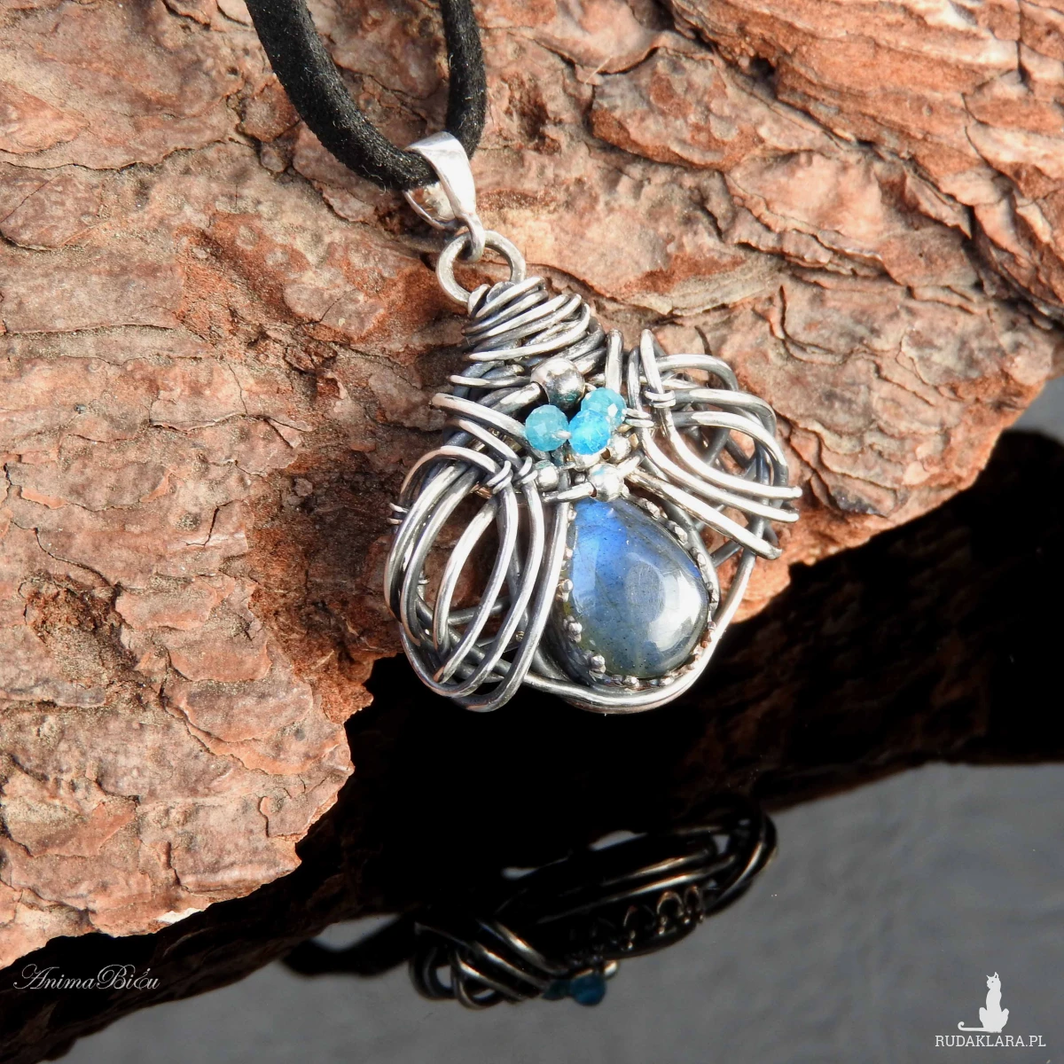 Wisiorek srebrny z labradorytem i apatytami. Wykonany od