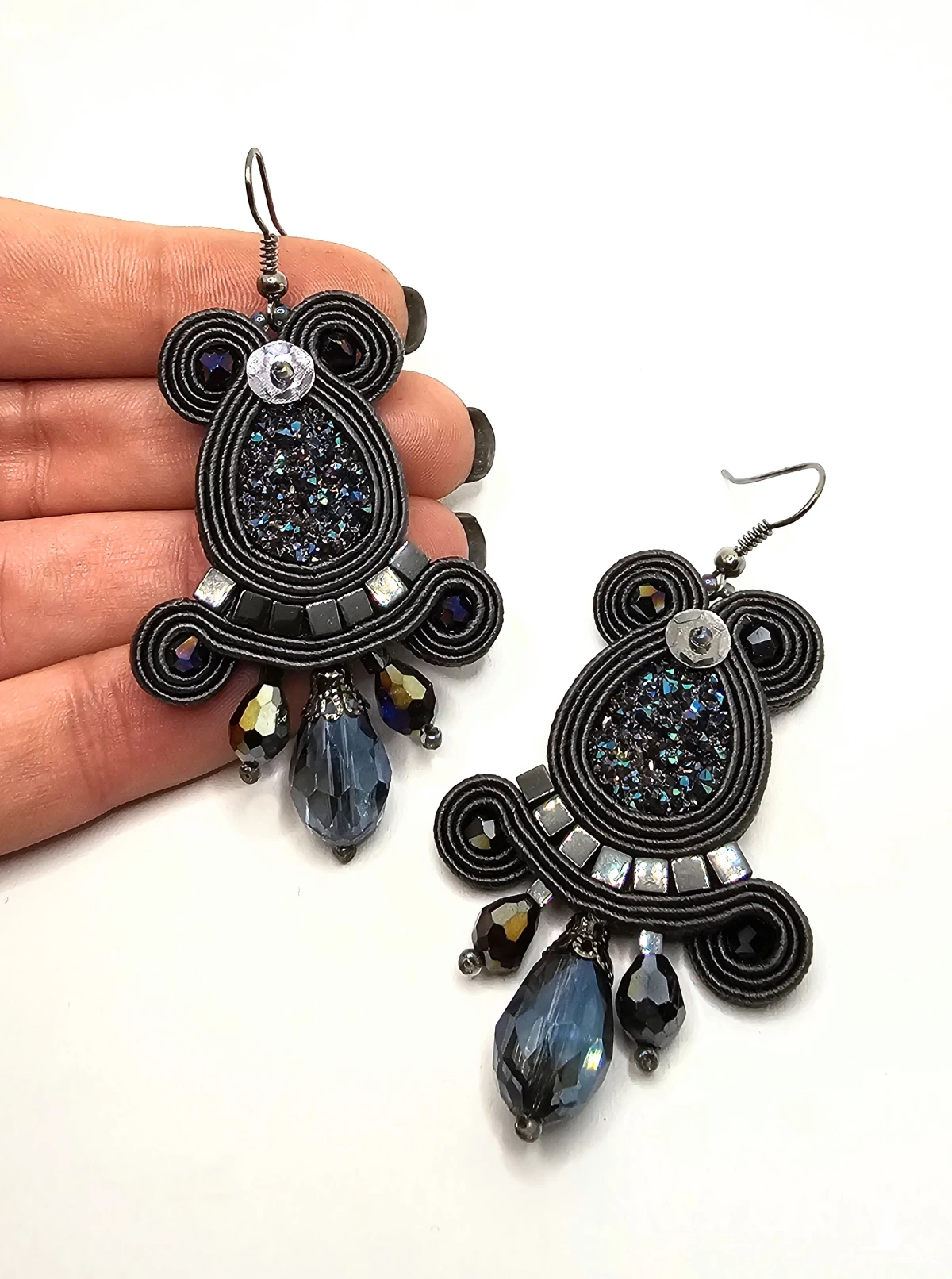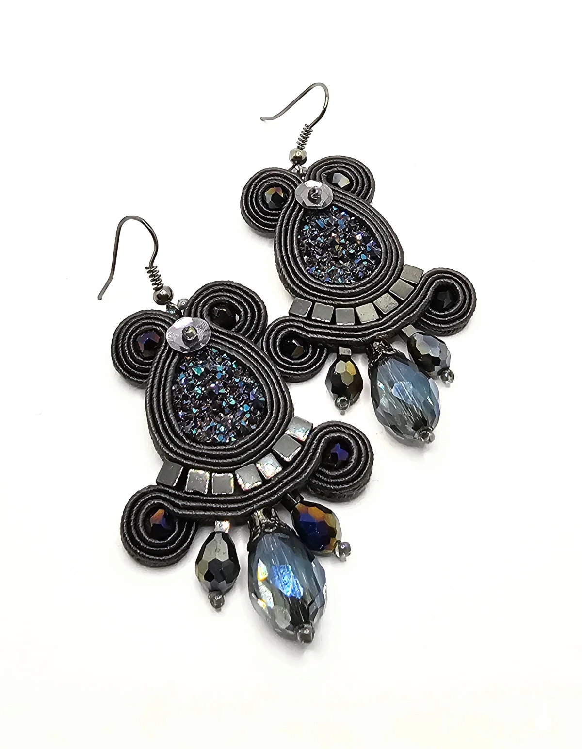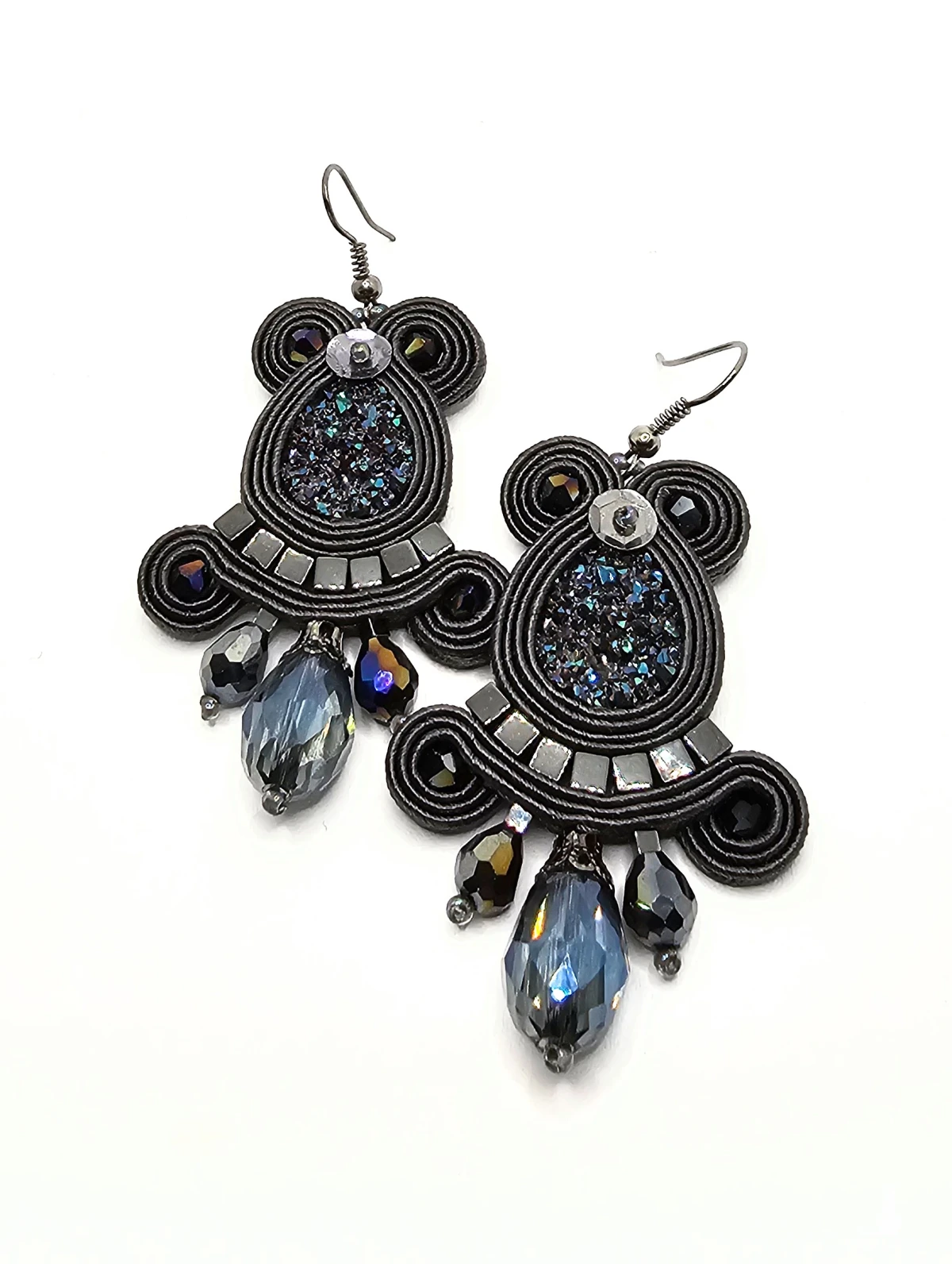 Mieniące się kaboszony z żywicy otoczone sznurkami sutasz oraz kostkami hematytu i niewielkimi kryształami. Dół kolczyków zdobią szklane kryształowe krople. Kolczyki zawieszone na klasycznych biglach w kolorze ciemnego srebra ze stali chirurgicznej.