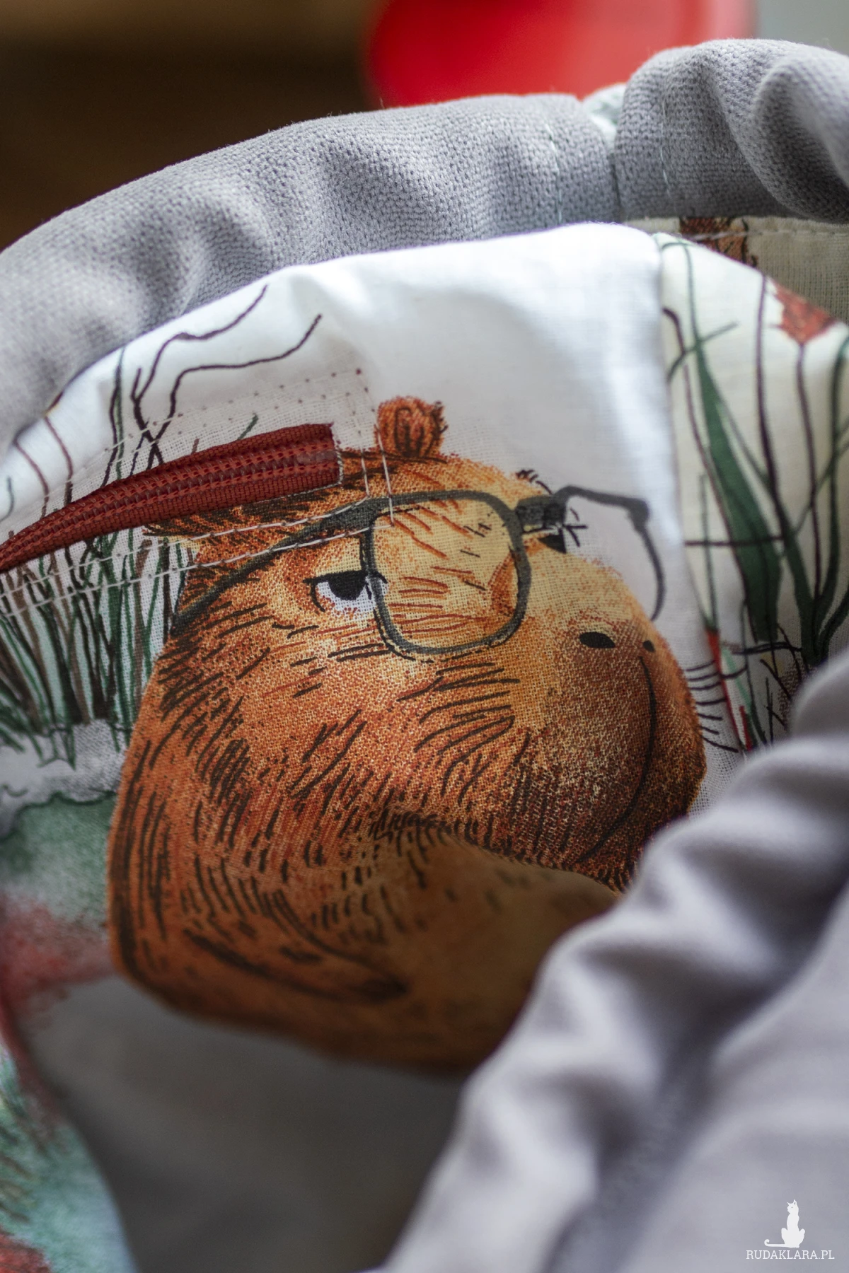 Wykonana z szarej tkaniny. Z przodu oraz z na tyle torebki kieszenie (np. na telefon czy chusteczki) w stylu patchworkowym. W środku kieszonka zapinana na suwak.
