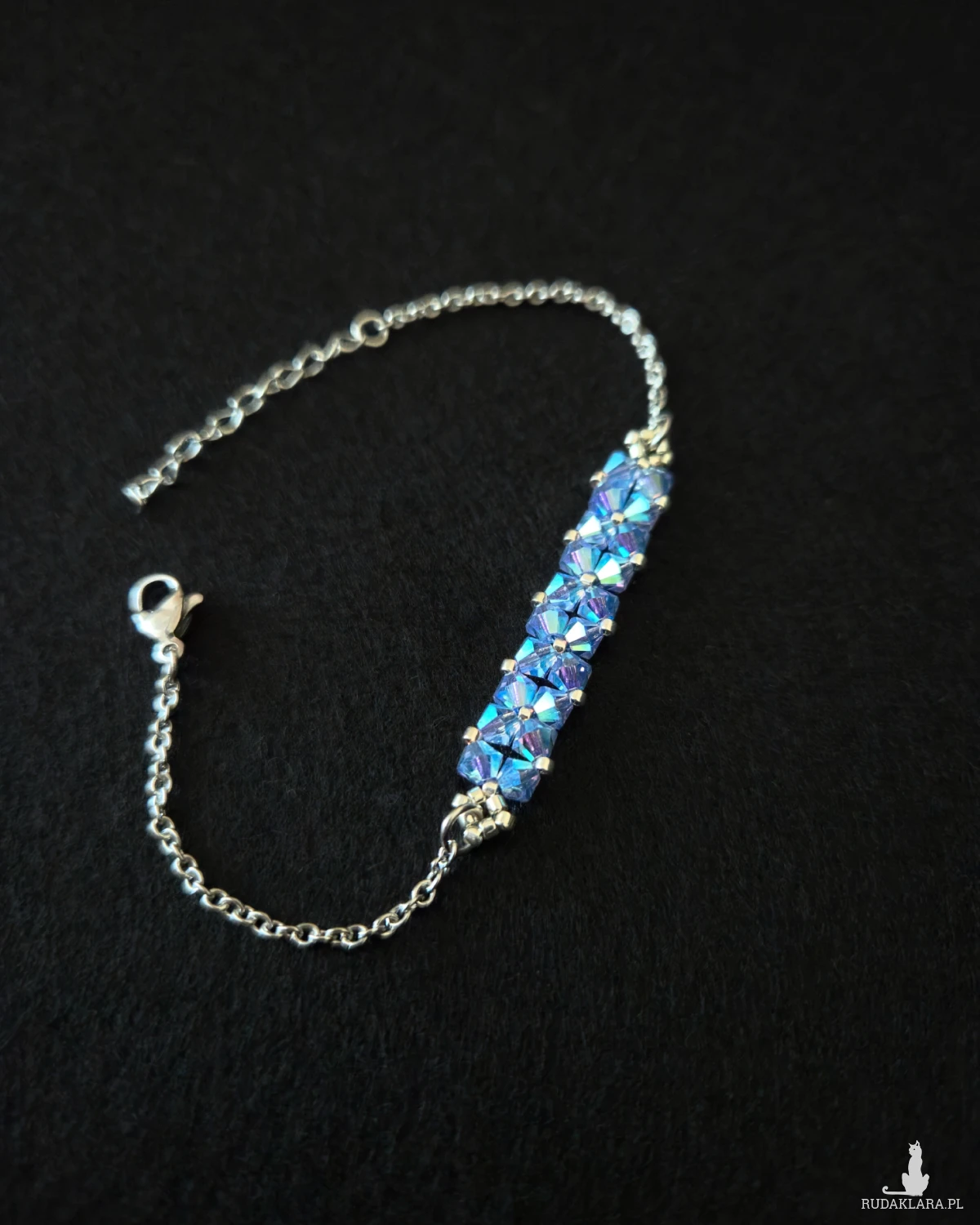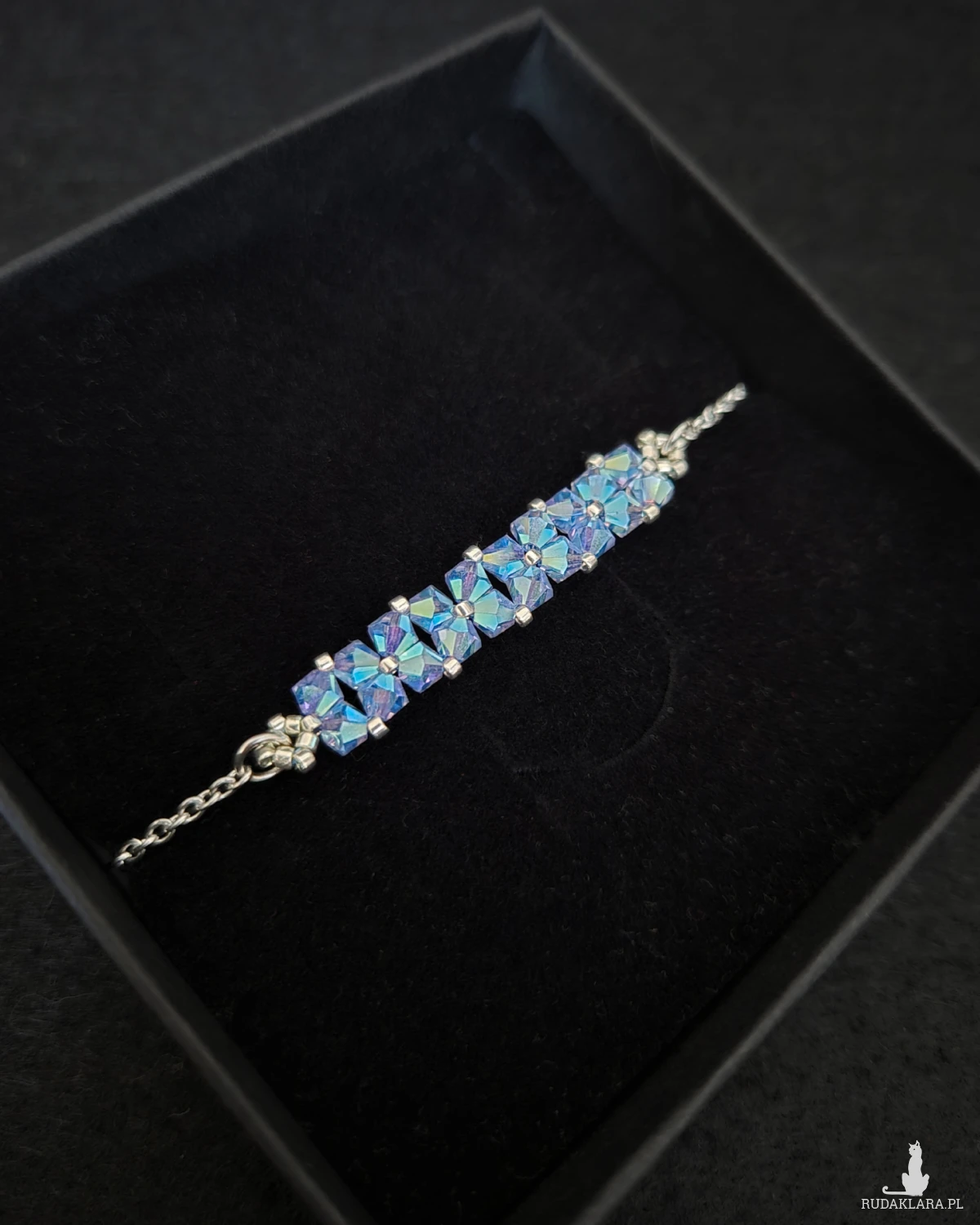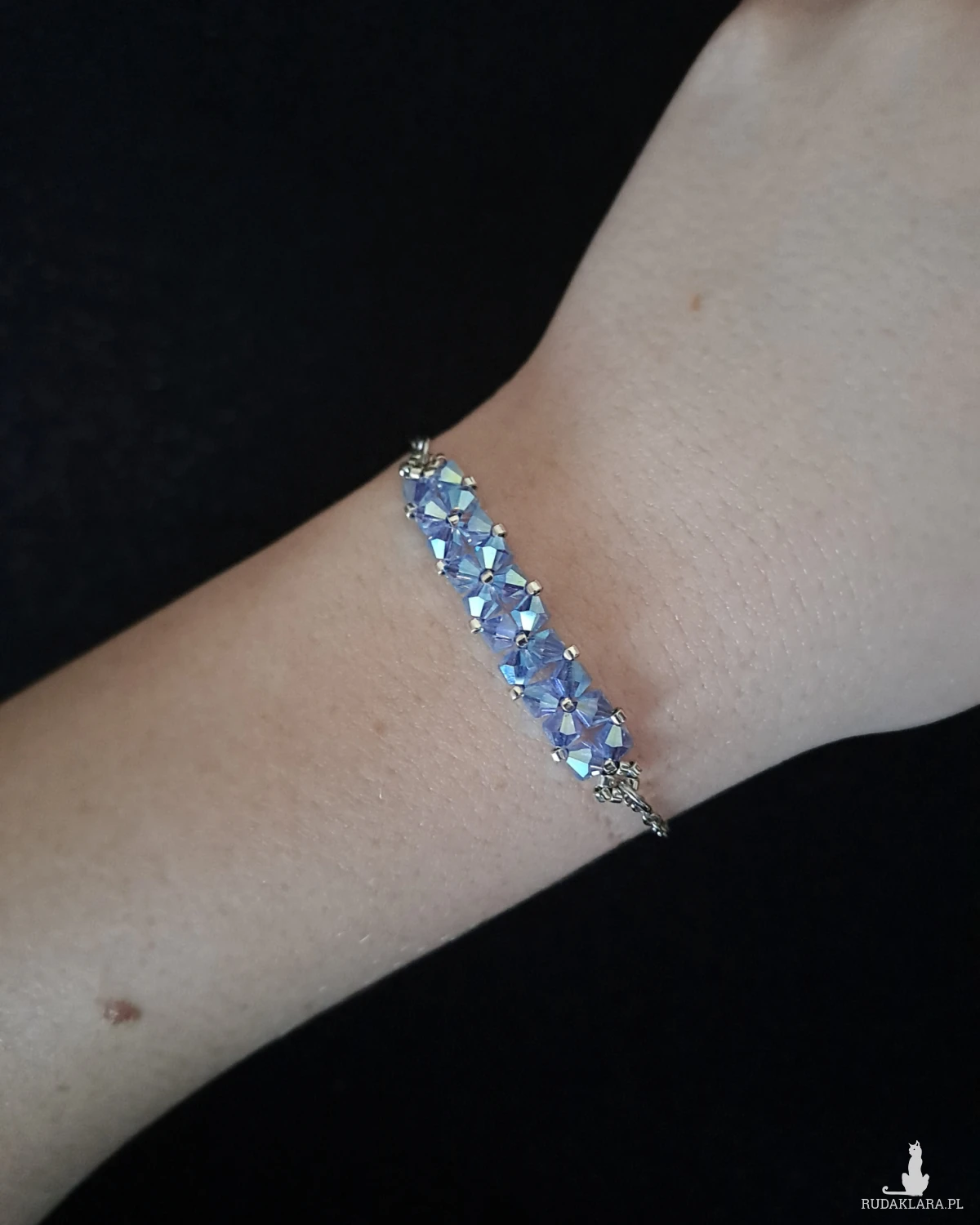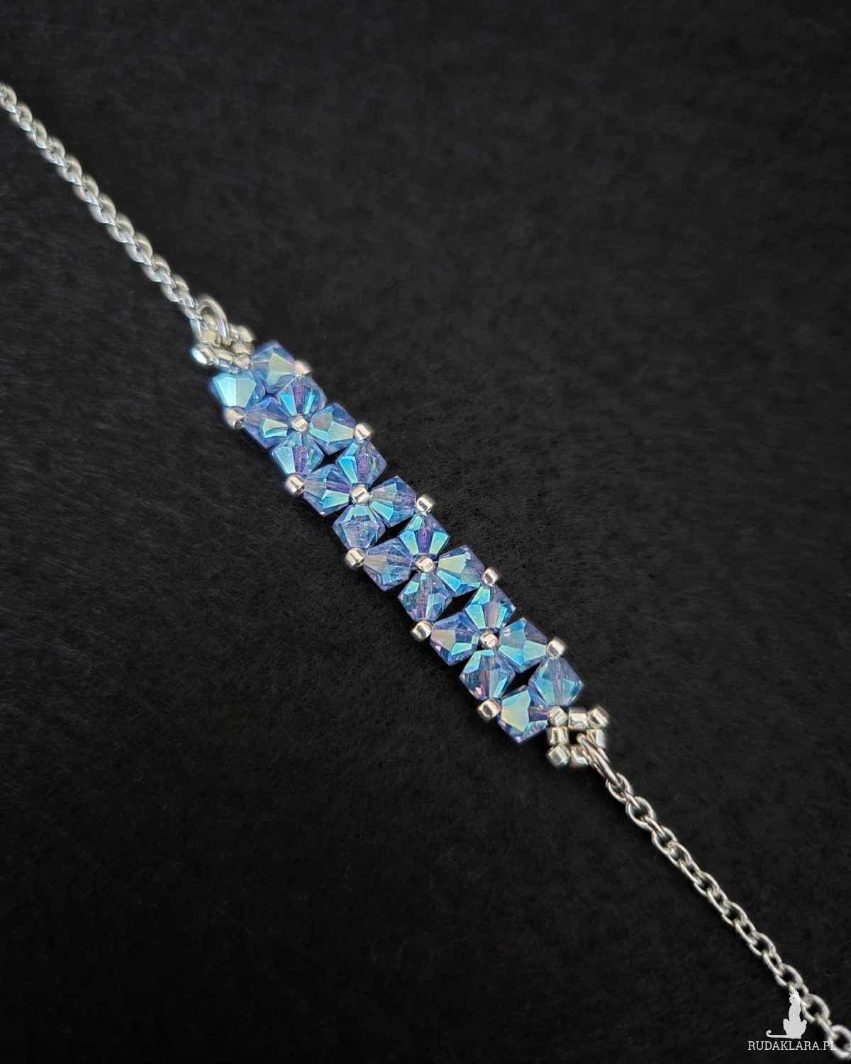 Bransoletka powstaje z kryształków Preciosa w kolorze Sapphire AB2x, które dzięki opalizującemu wykończeniu pięknie odbijają światło, ukazując głębię chłodnego błękitu z delikatnym, tęczowym połyskiem. Towarzyszą im drobne koraliki Miyuki Delica w srebrnym odcieniu, znane z wyjątkowej regularności i precyzji wykonania.