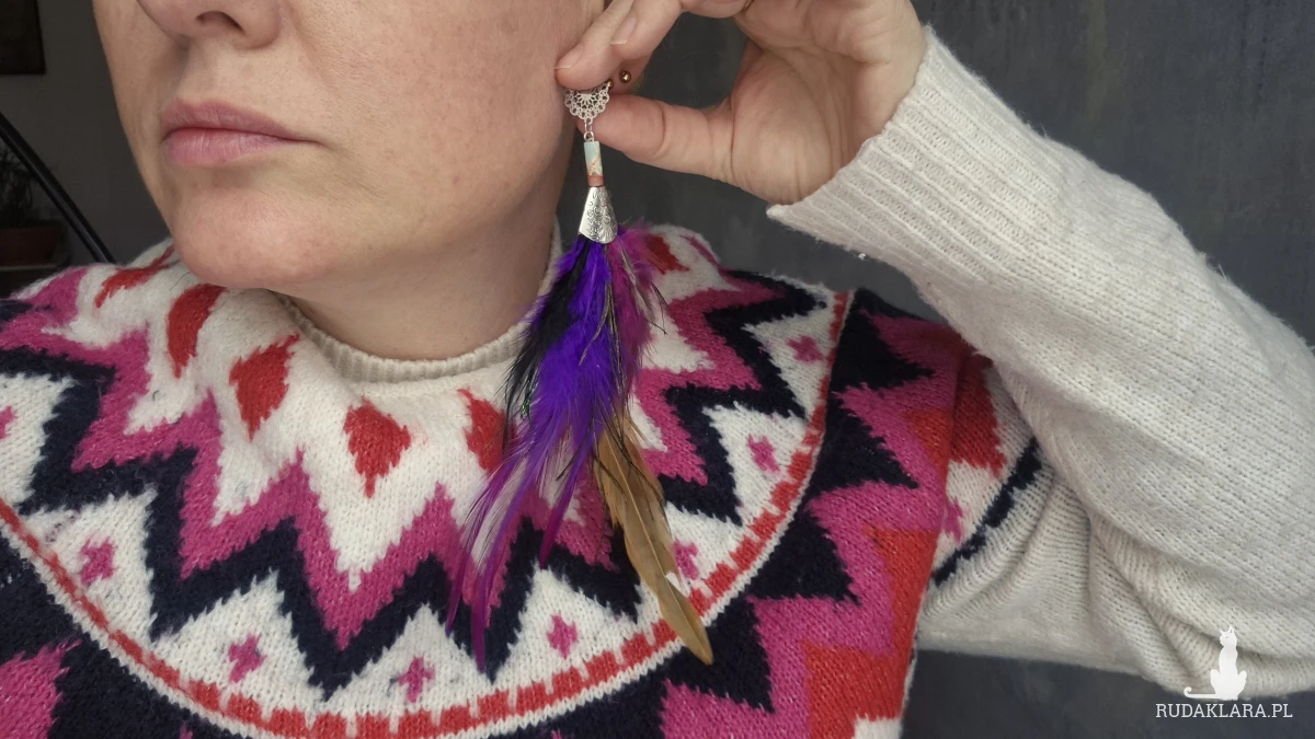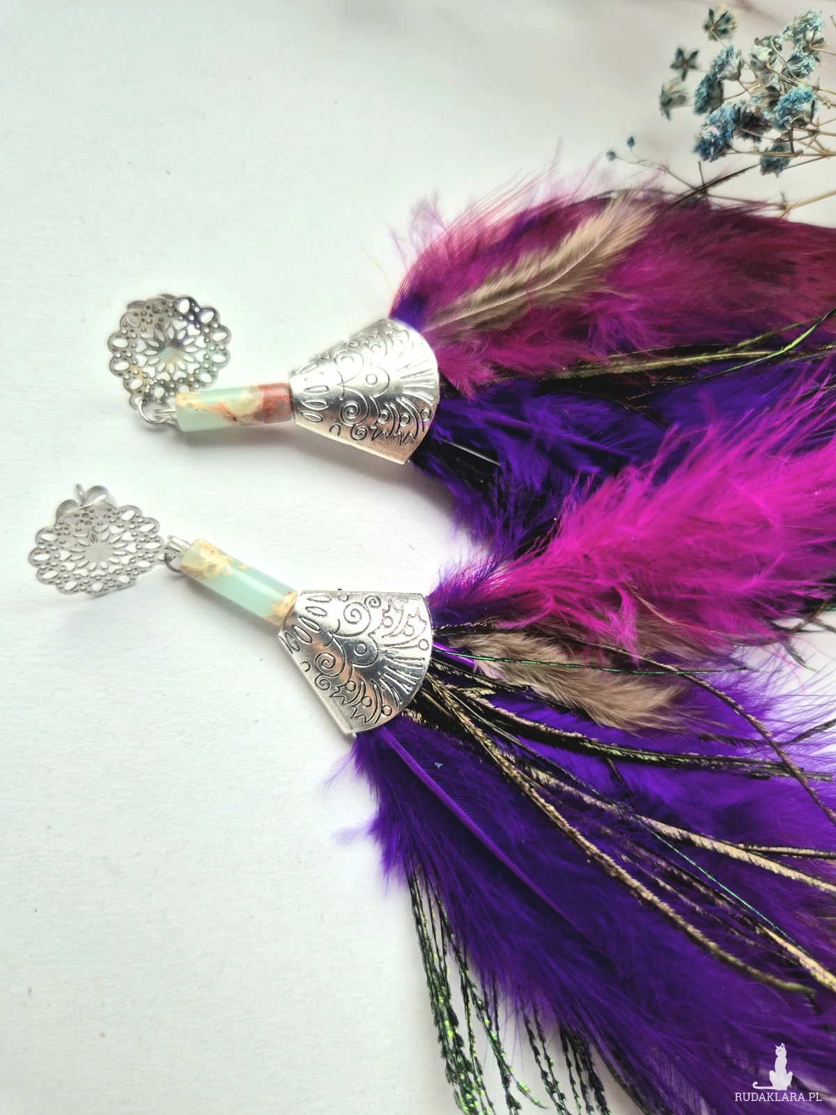 Kolczyki kolorowe energetyczne  pióra duże lekkie wykonane w pojedynczym egzemplarzu rękodzieło