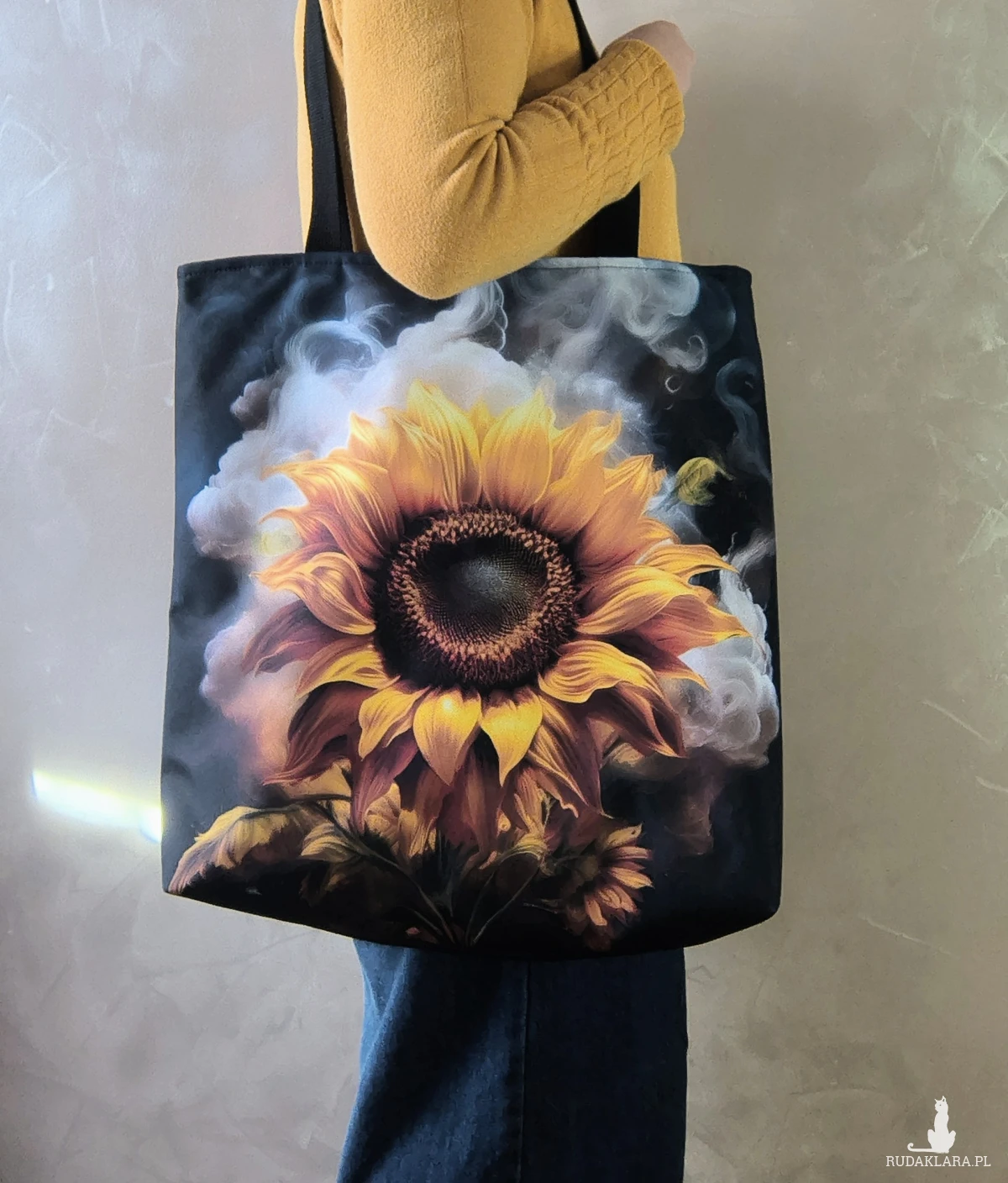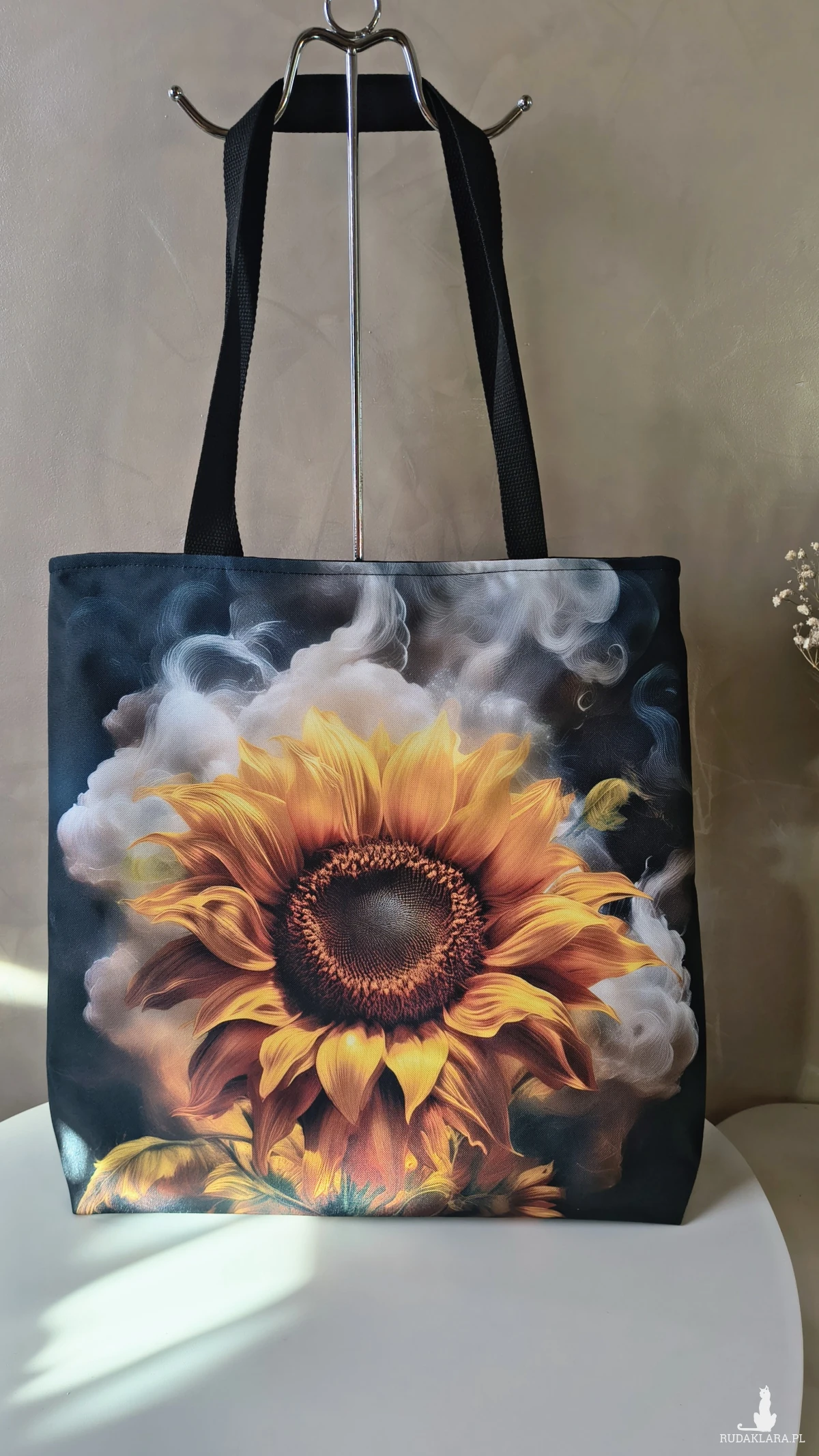 To całkiem spora torba, a do tego wytrzymała Wykonana z materiału wodoodpornego, więc nie straszny jej deszcz czy zabrudzenia. Wewnątrz znajduje się wodoodporna podszewka z kieszonką na zamek. Zapinana na zamek. Na przedniej ścianie panel z pięknym słonecznikiem. Tył torby czarny. .