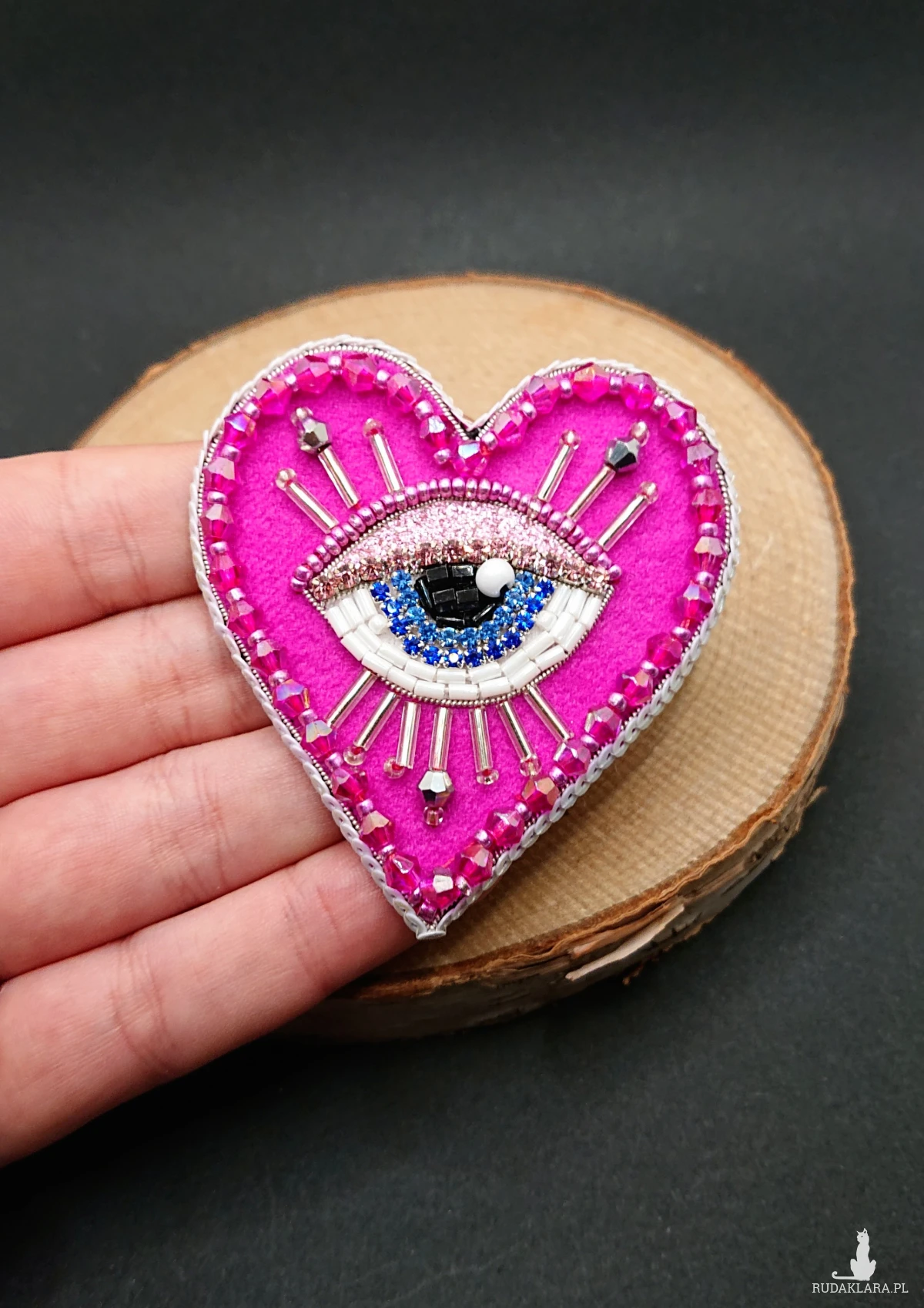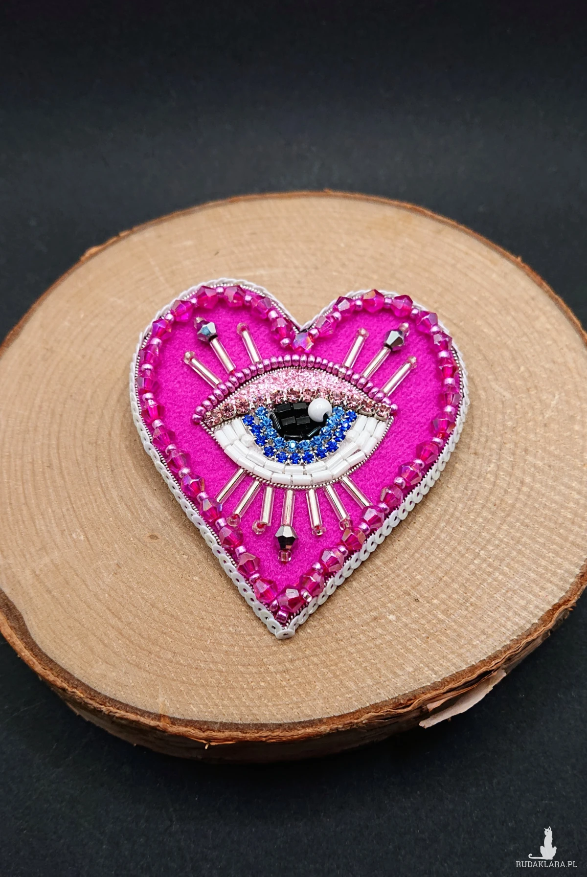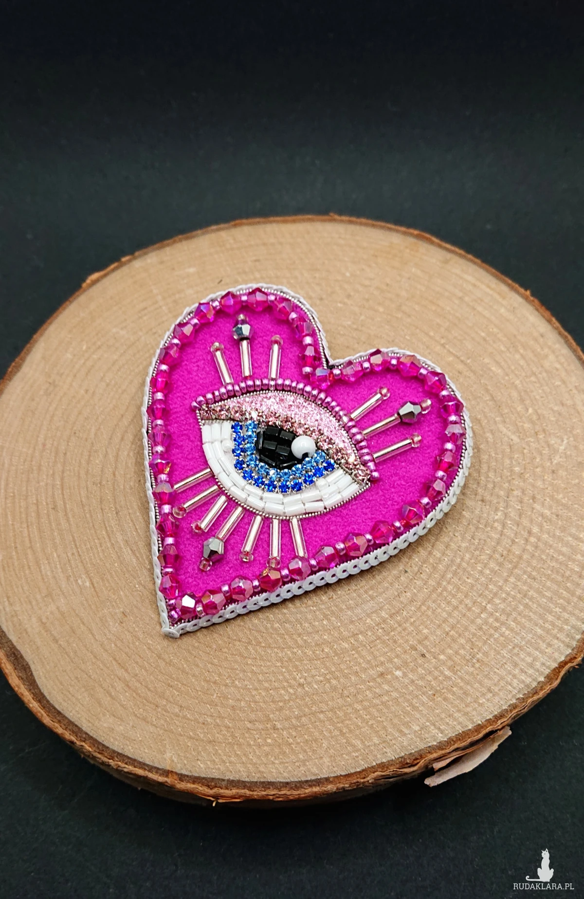 Broszka w kształcie serca z niebieskim okiem. Wykonana z szklanych koralików o różnych kształtach i wielkościach, taśmy z cyrkoniami oraz niewielkich szklanych koralików. Broszka w kolorze intensywnego różu z srebrnymi dodatkami