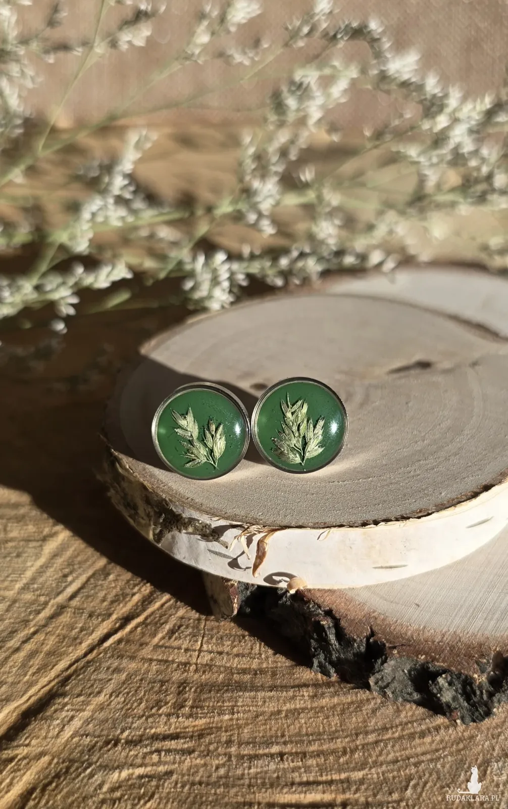 Srebrne kolczyki z kwiatami wkręty sztyfty z żywicy żywica epoksydowa z suszonymi prawdziwymi kwiatami zielone zboża