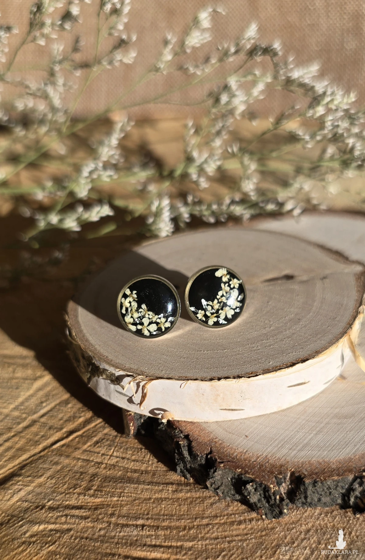 Srebrne kolczyki z kwiatami wkręty sztyfty z żywicy żywica epoksydowa z suszonymi prawdziwymi czarne
