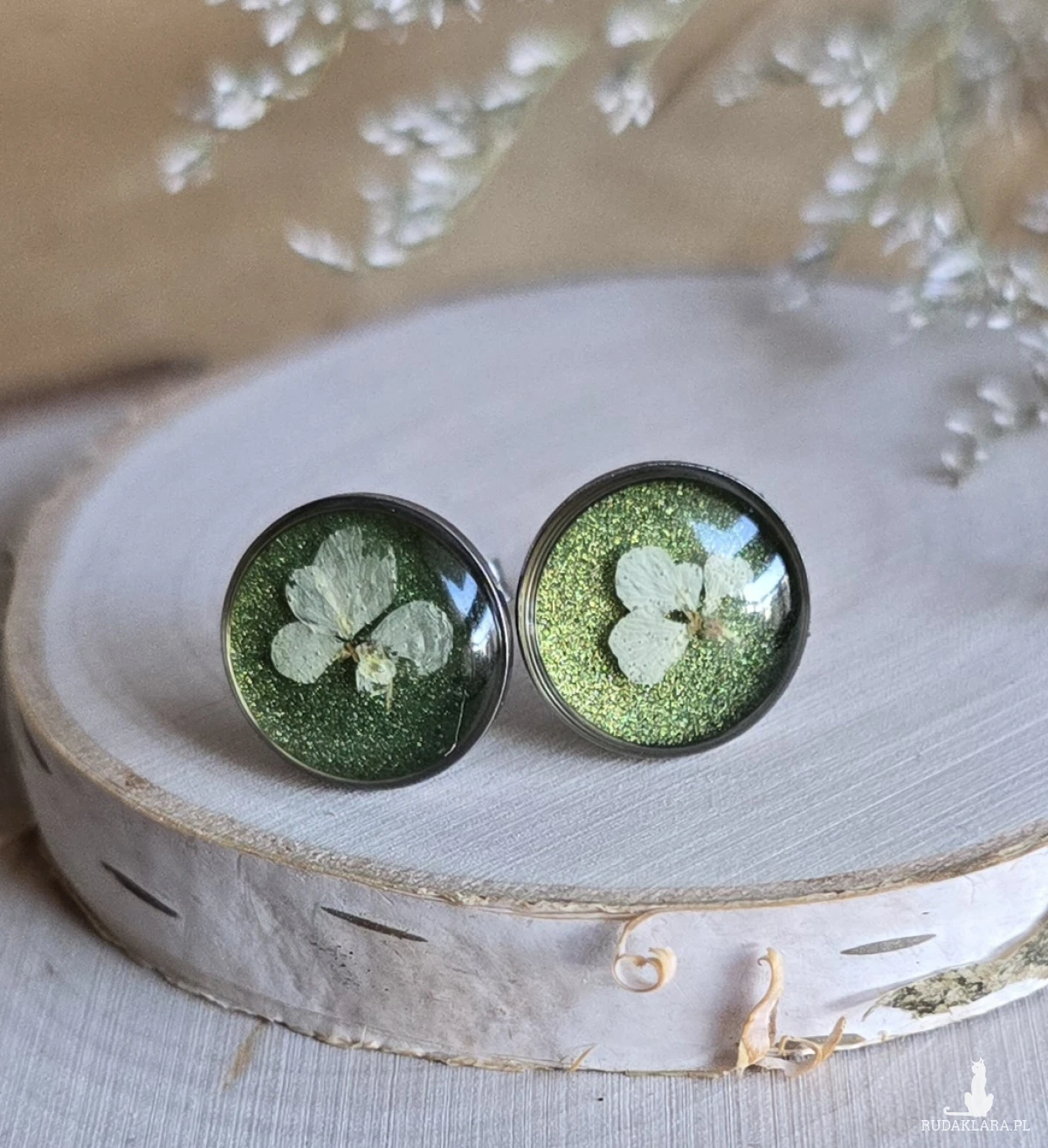 Srebrne kolczyki z kwiatami wkręty sztyfty z żywicy żywica epoksydowa z suszonymi prawdziwymi kwiatami zielone dzika marchew brokat