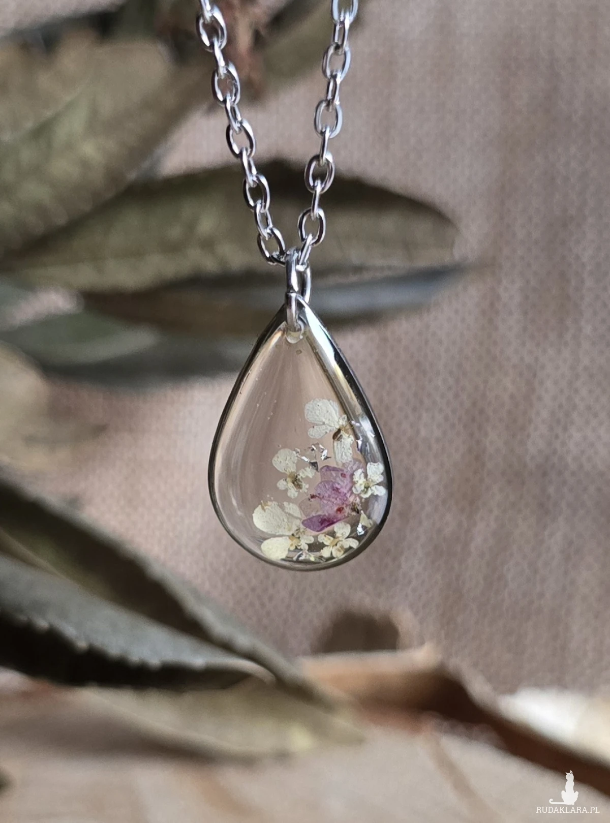 Oferuję Państwu unikalną biżuterię. Zawieszka jest wykonana z suszonych kwiatów i żywicy epoksydowej. Biżuteria jest wspaniałym i oryginalnym prezentem na lata.