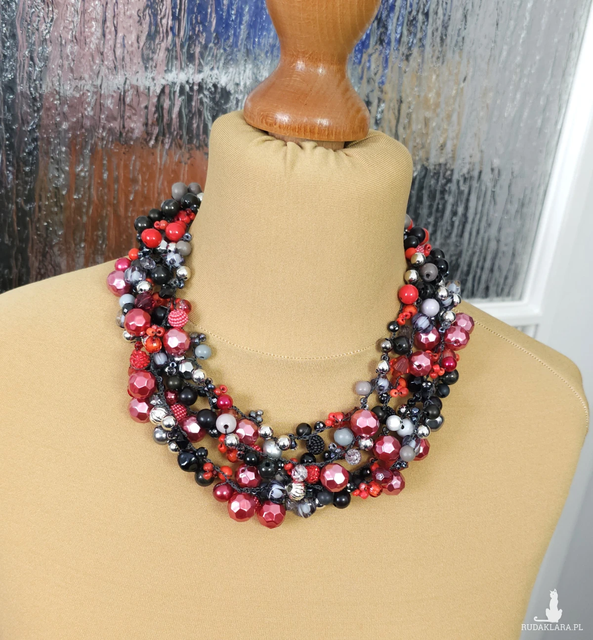 Ten ręcznie wykonany naszyjnik to połączenie dziesiątek koralików o różnych fakturach i kształtach.