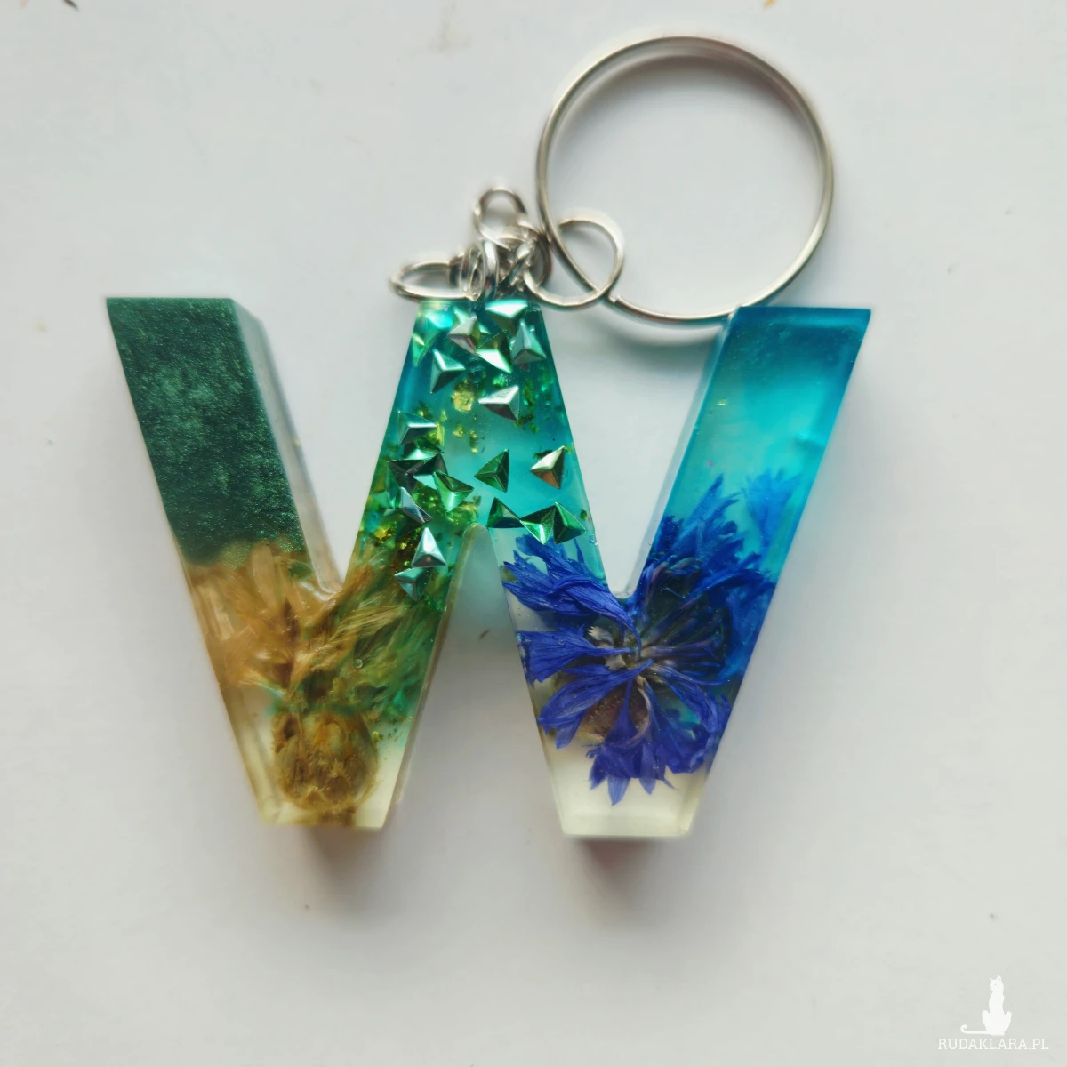 Brelok literka w niebieska i zieleń z chaber biały i złoto
