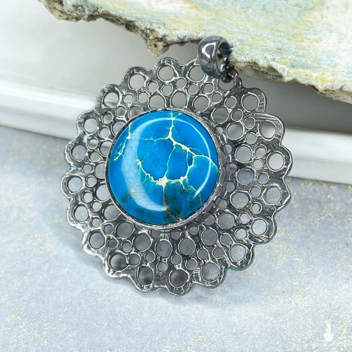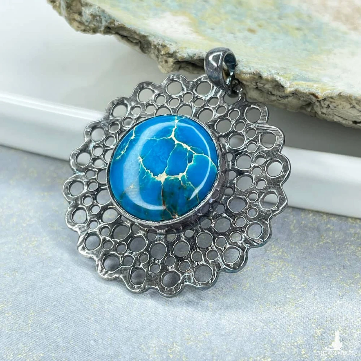 Wisior ze srebra próby 925 jest inspirowany delikatnymi strukturami koronki. W środku okrągłej formy wykonanej techniką metaloplastyki znajduje się błękitny jaspis cesarski o średnicy 15 milimetrów. Ażurowa struktura naszyjnika jest bogata w detale, które urozmaicą klasyczną lub minimalistyczną stylizację. Będzie również trafionym prezentem dla bliskiej osoby, która ceni sobie oryginalne dodatki na co dzień. Wykonany jest z oksydowanego srebra próby 925, dzięki czemu odcień srebra jest ciemniejszy, a ażurowa struktura wisiora subtelnie podkreślona.