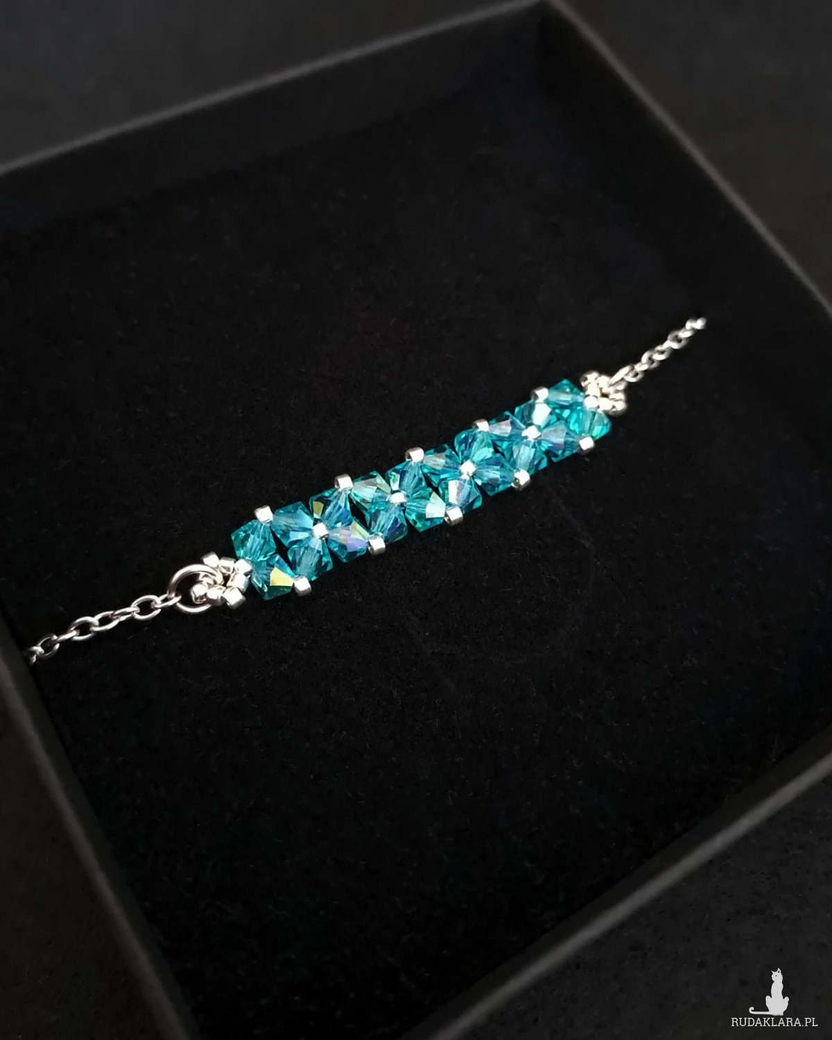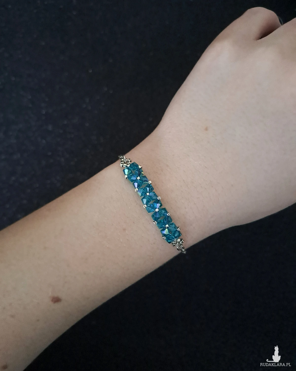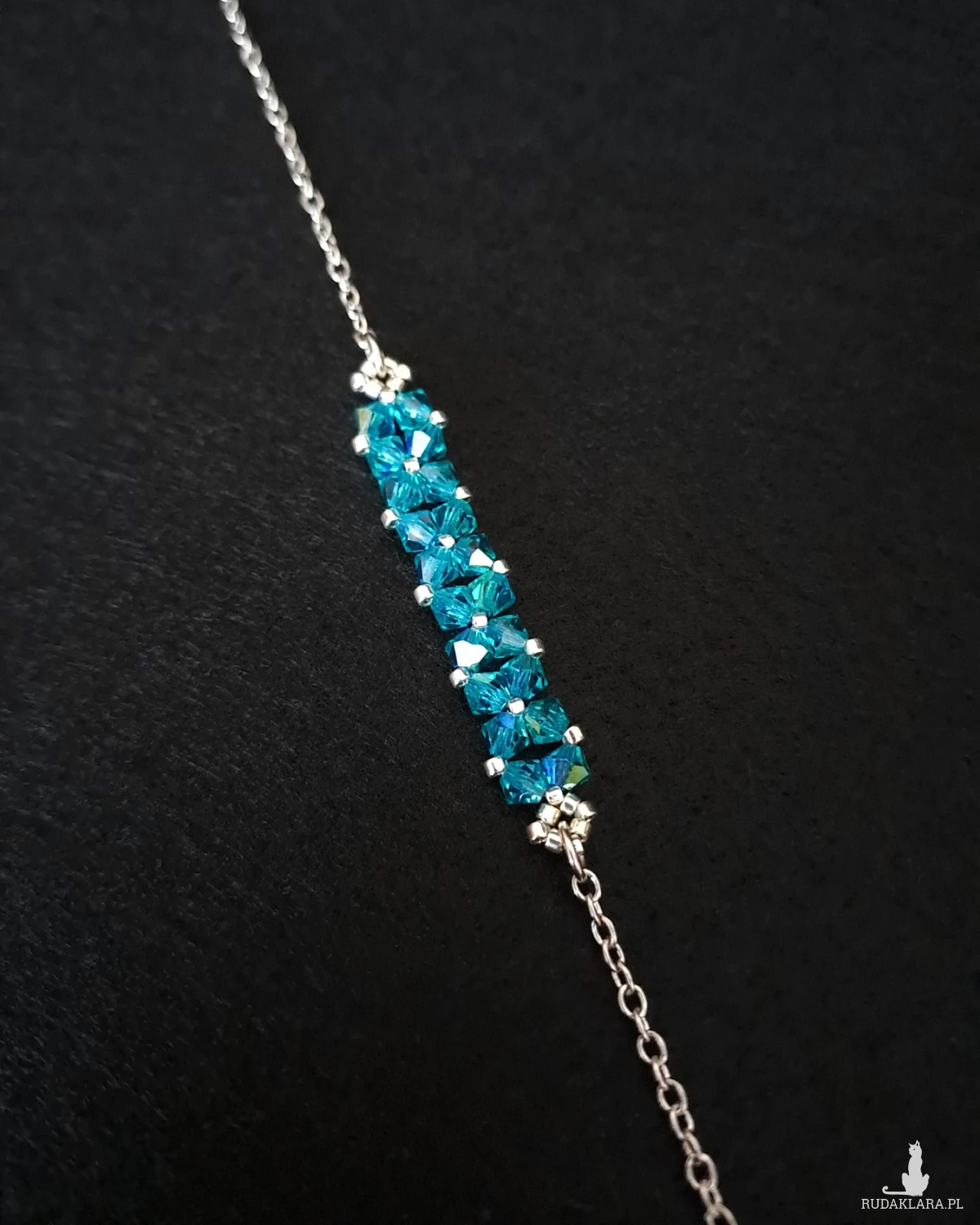 Bransoletka powstaje z kryształków Preciosa w kolorze Blue Zircon AB, które dzięki opalizującemu wykończeniu pięknie odbijają światło, ukazując intensywny, chłodny odcień turkusowego błękitu z delikatnym, tęczowym połyskiem. Towarzyszą im drobne koraliki Miyuki Delica w srebrnym odcieniu, znane z wyjątkowej regularności i precyzji wykonania.