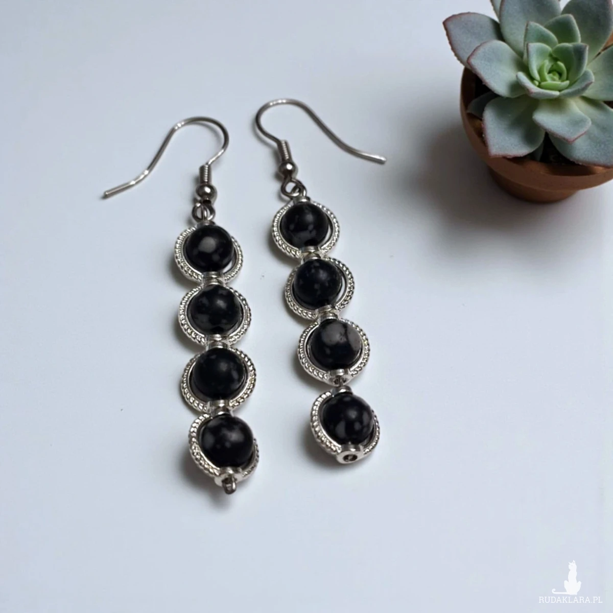 Kolczyki z kamienia obsydianu śnieżnego to elegancka i wyjątkowa biżuteria. Czarny kolor z szarymi przetarciami oraz pierścienie w kolorze srebrnym wokół kamieni dodają im uroku