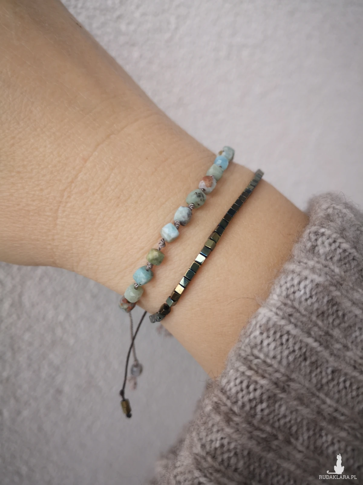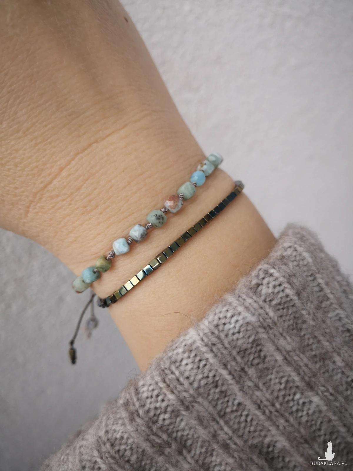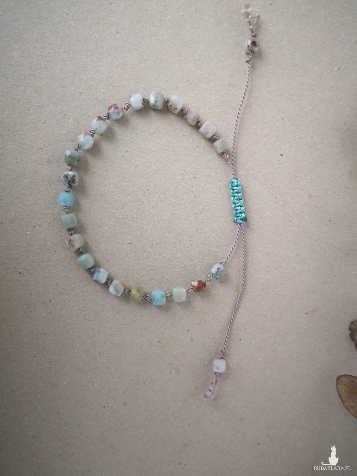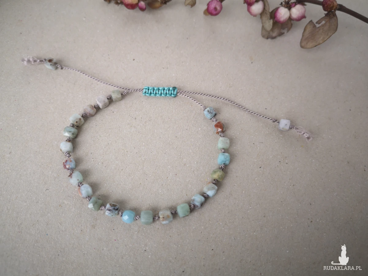 Fasetowane kostki larimaru ok 4 mm na nici jedwabnej, makramowe zapięcie.