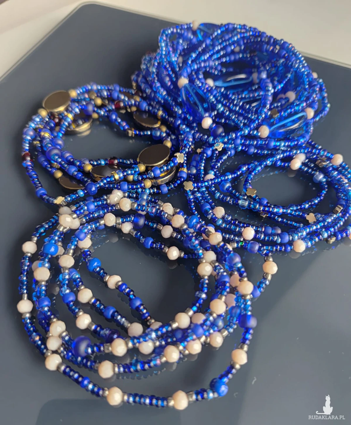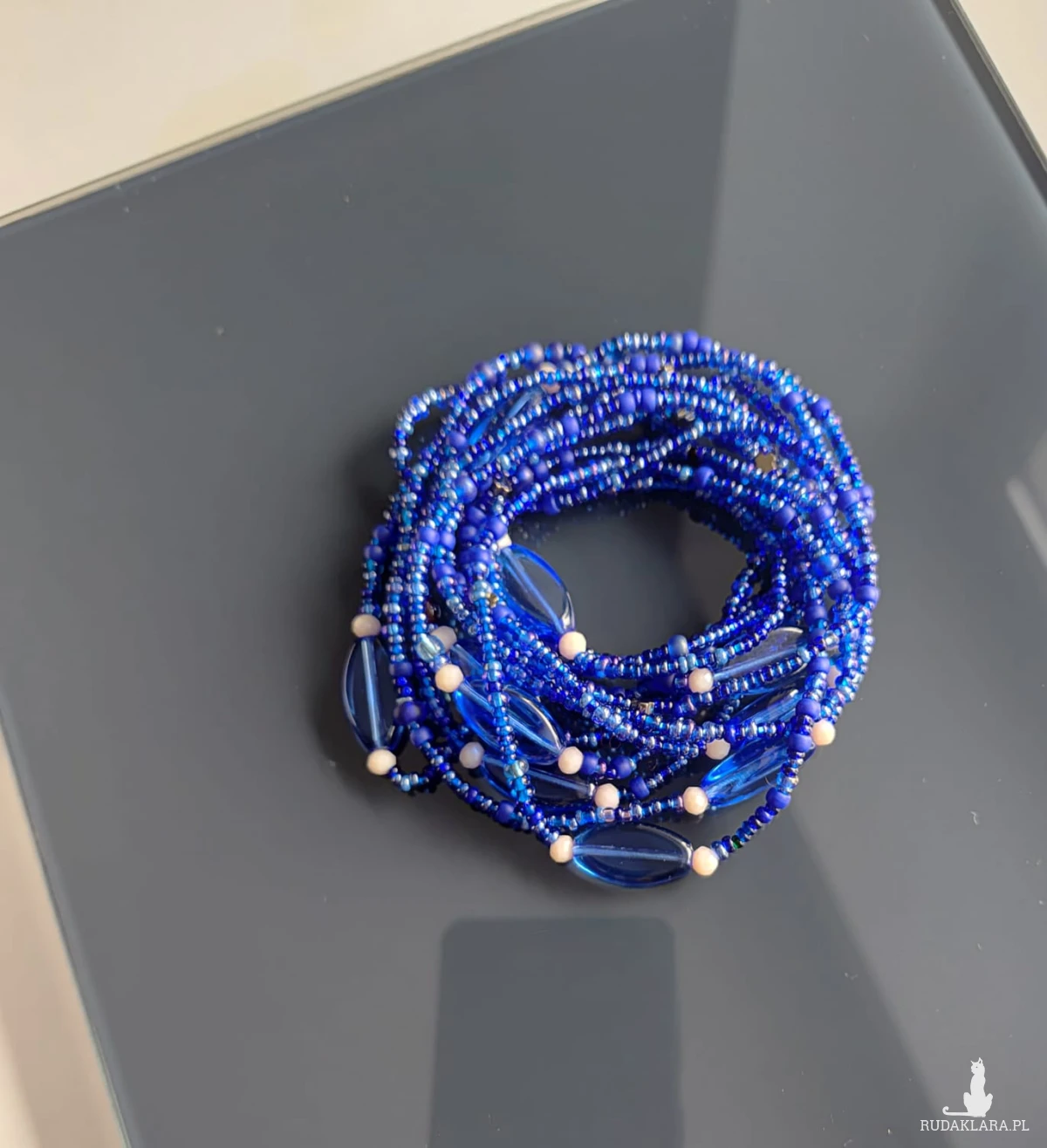 koralików w tym samym odcieniu niebieskim. Przeplatane są kryształkami w