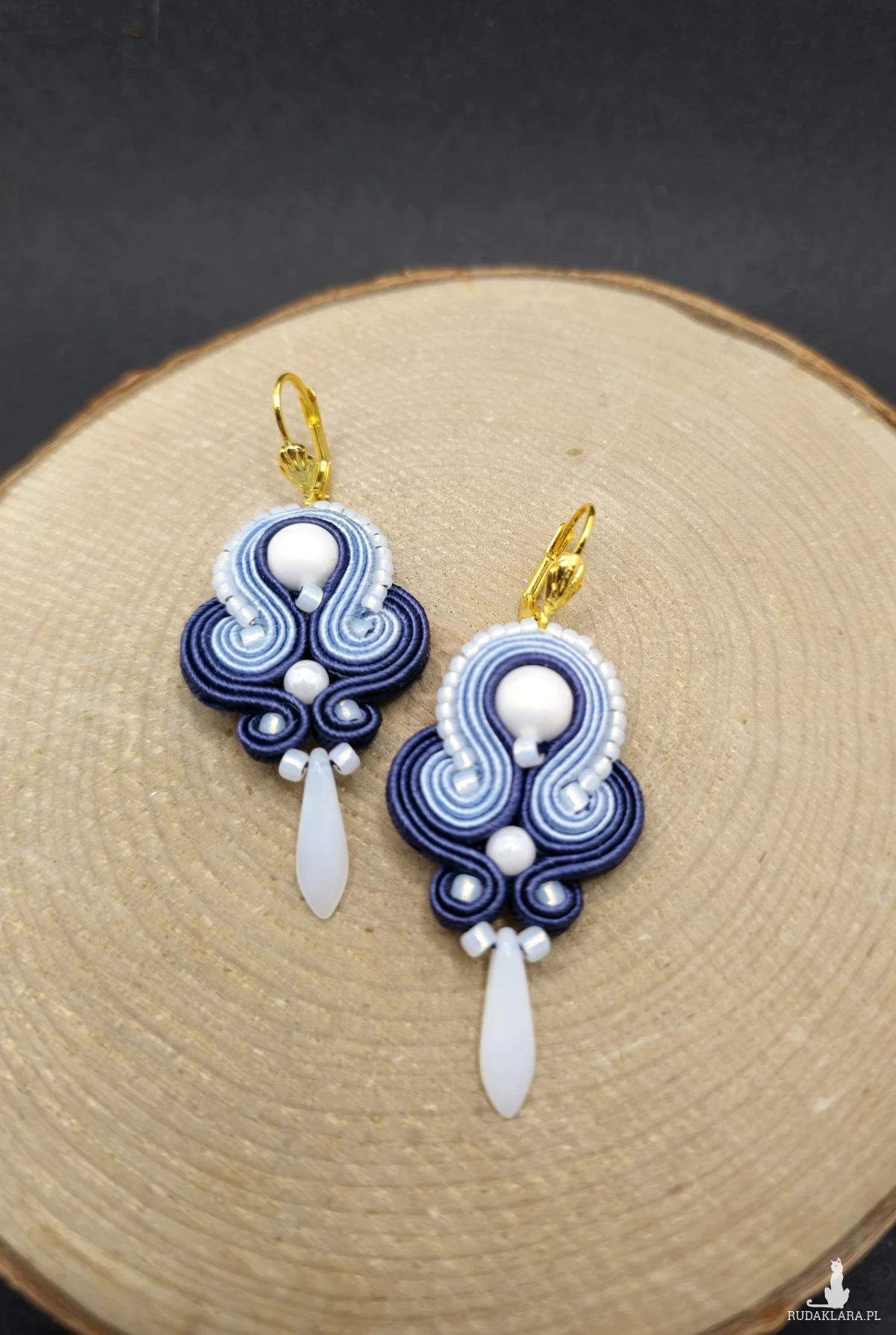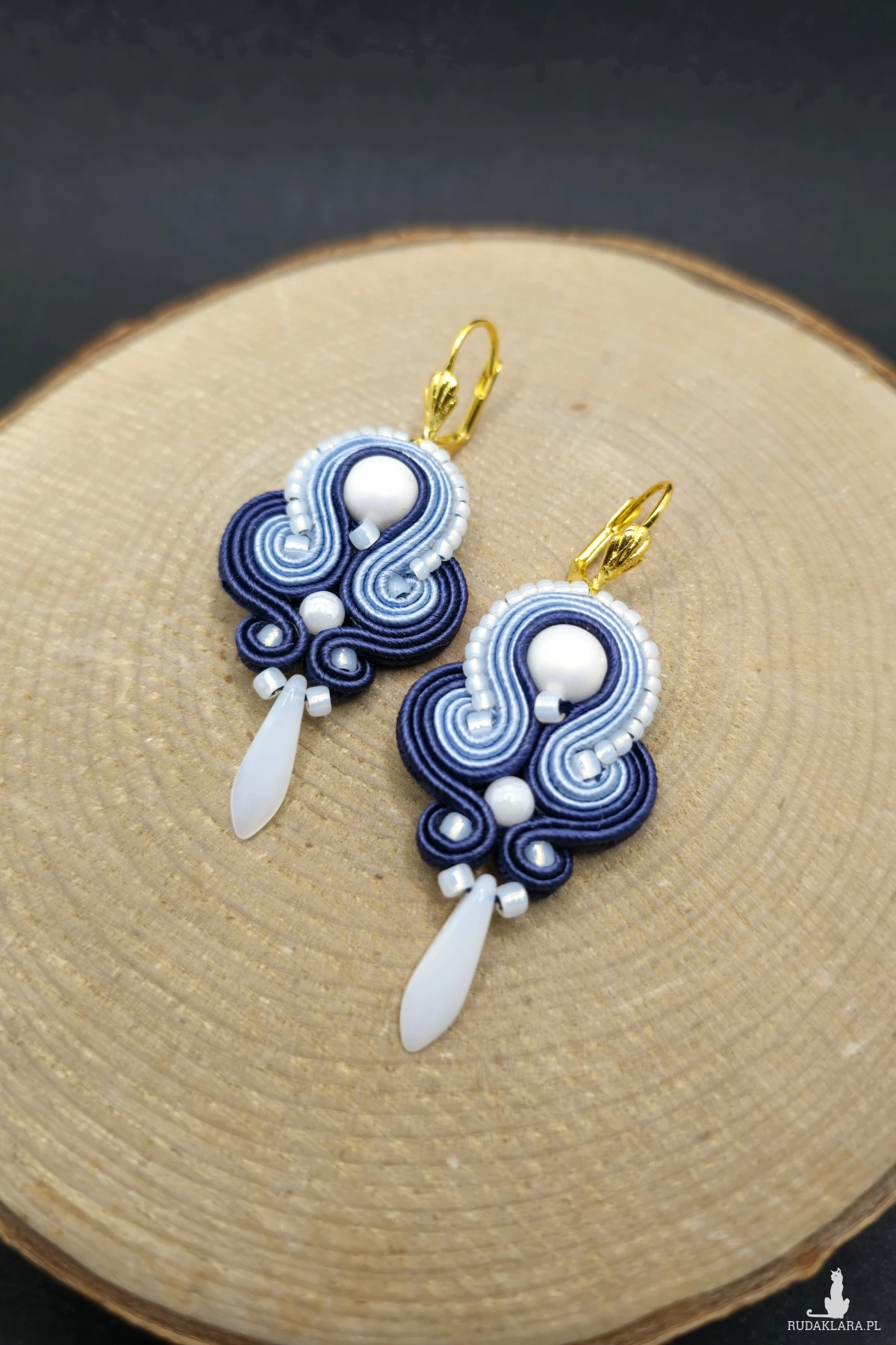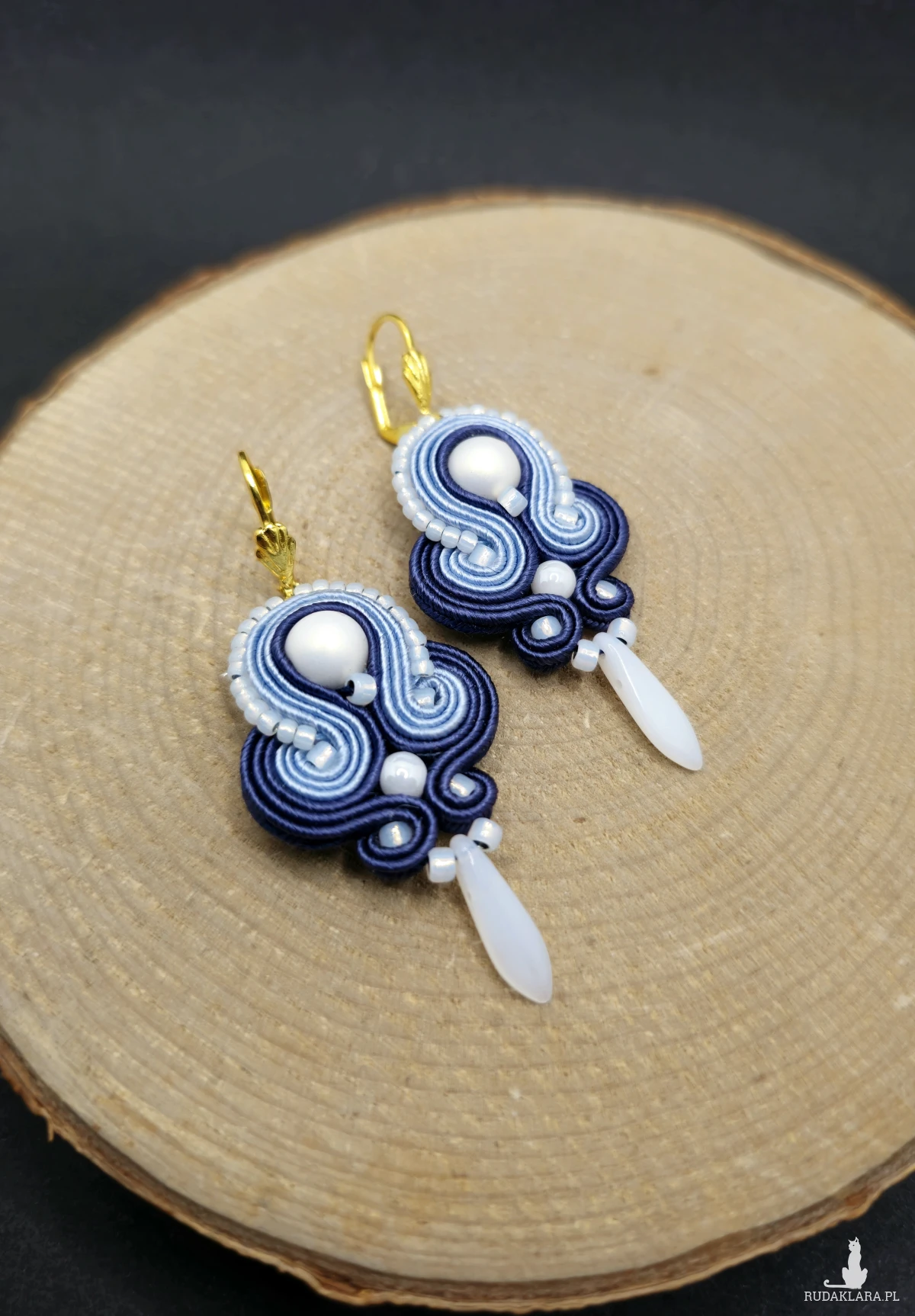 Białe mieniące się kulki otoczone sznurkami sutasz oraz szklanymi czeskimi i japońskimi koralikami o rożnych kształtach i wielkościach. Dół kolczyków zdobią szklane wiszące koraliki. Kolczyki zawieszone na ozdobnych biglach angielskich w kolorze złotym.