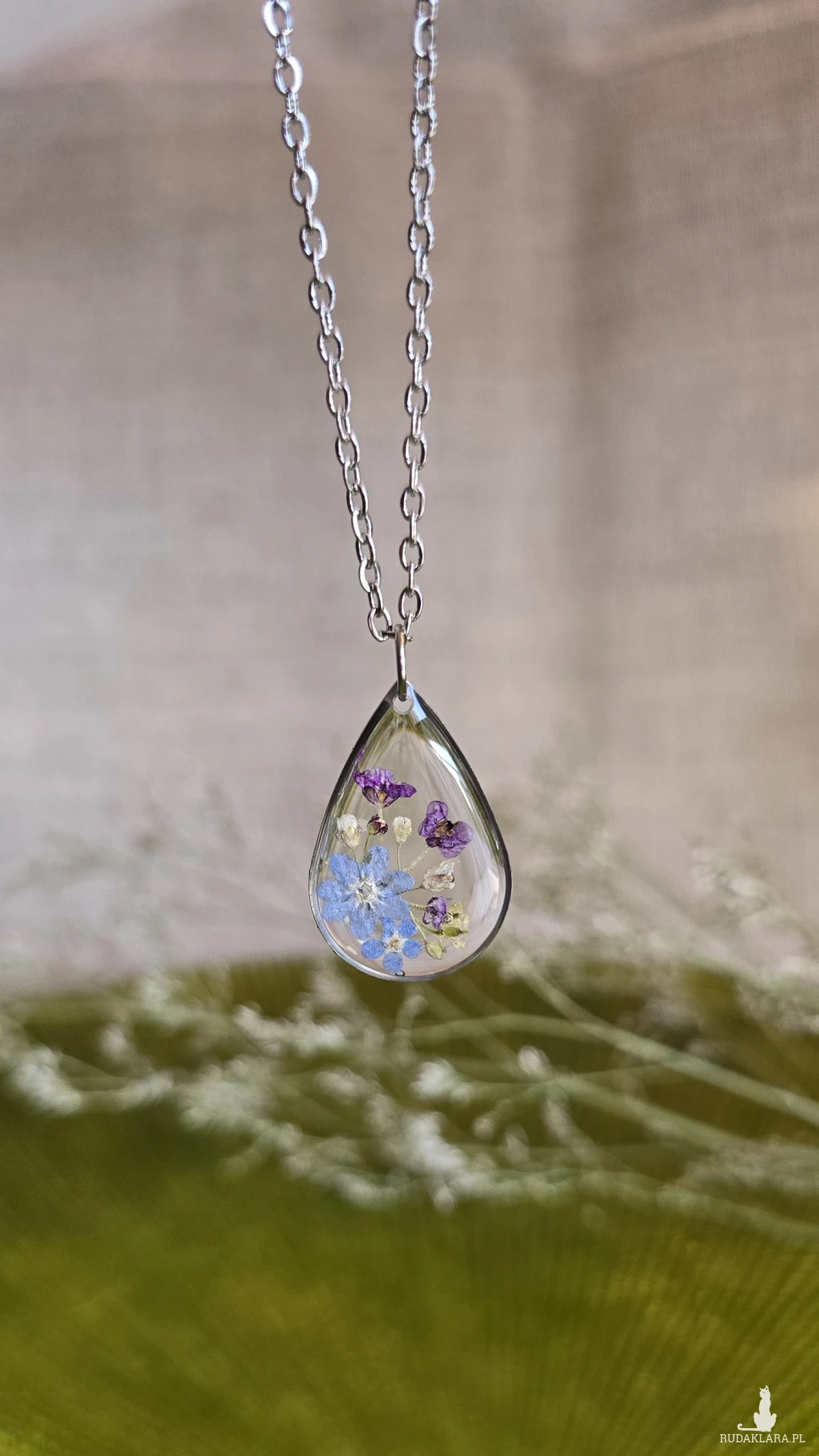 Oferuję Państwu unikalną biżuterię. Zawieszka jest wykonana z suszonych kwiatów i żywicy epoksydowej. Biżuteria jest wspaniałym i oryginalnym prezentem na lata.