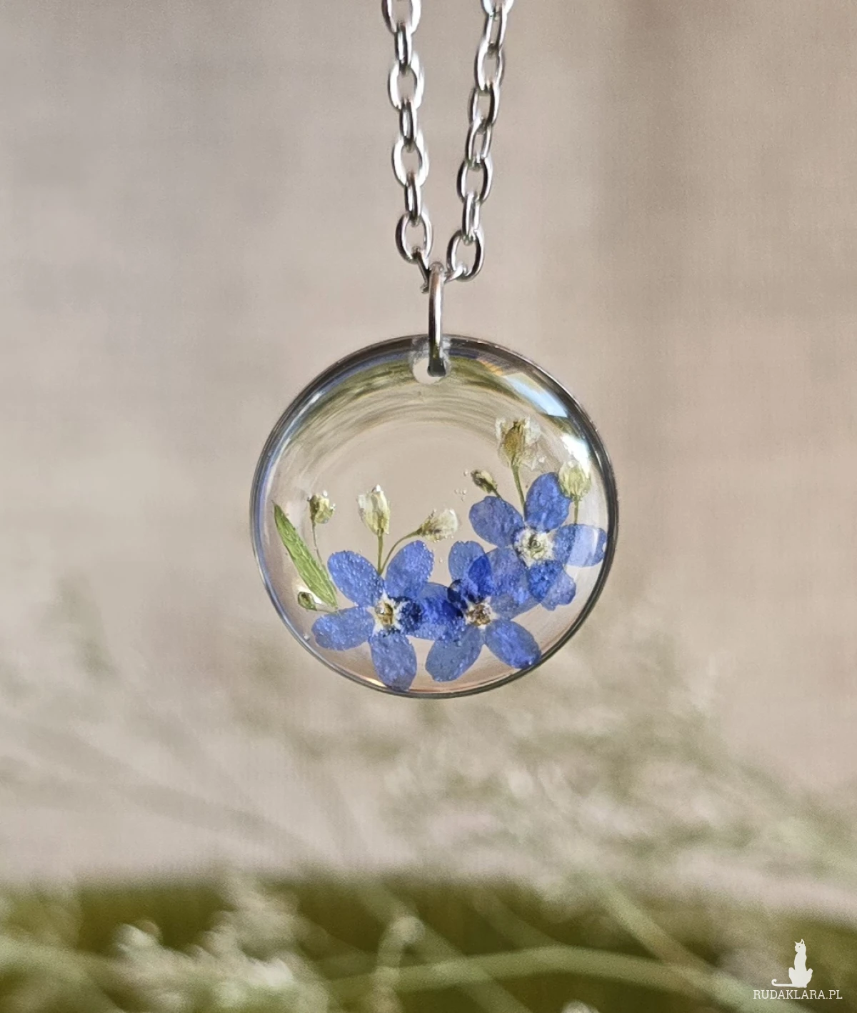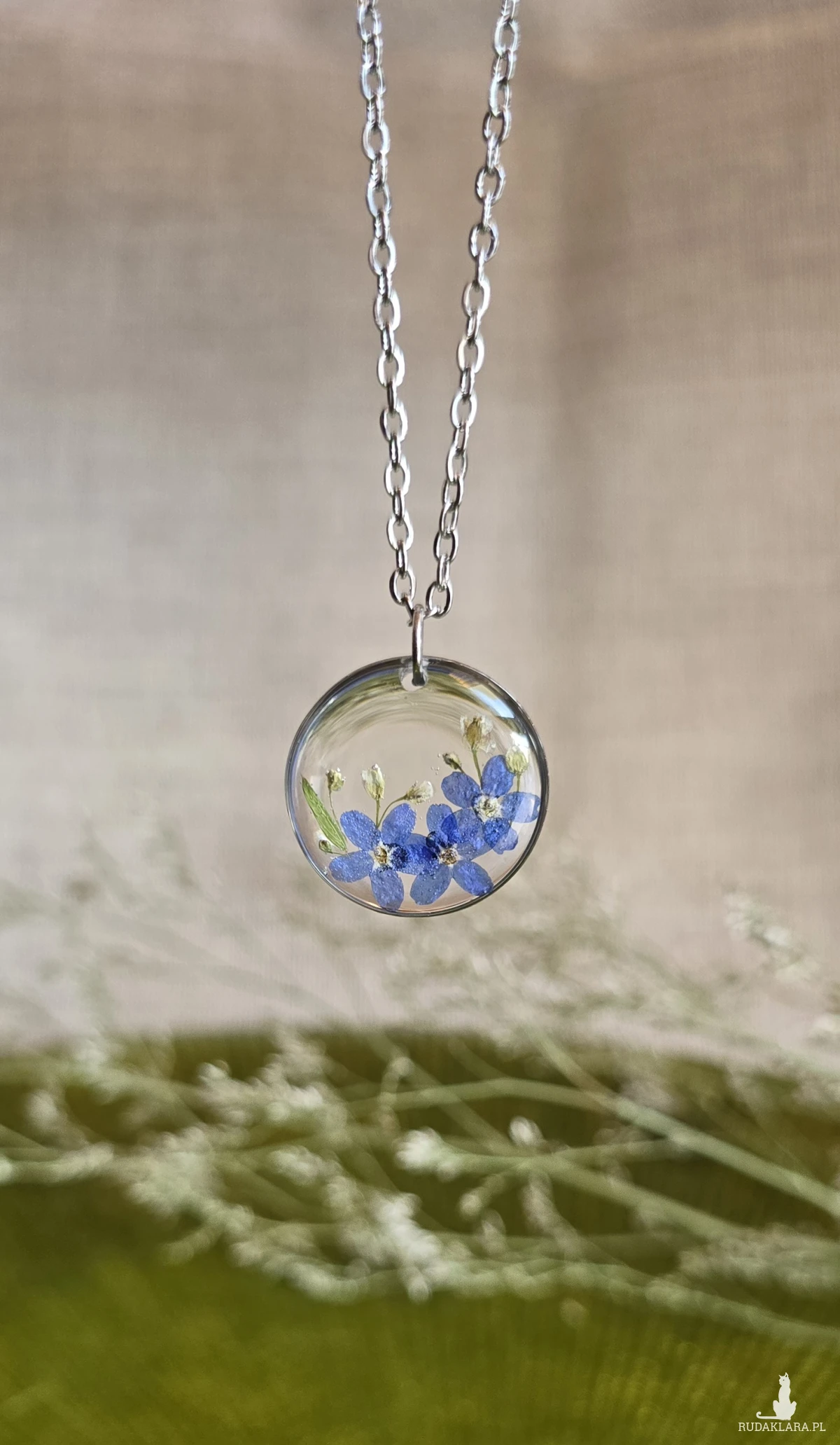 Oferuję Państwu unikalną biżuterię. Zawieszka jest wykonana z suszonych kwiatów i żywicy epoksydowej. Biżuteria jest wspaniałym i oryginalnym prezentem na lata.