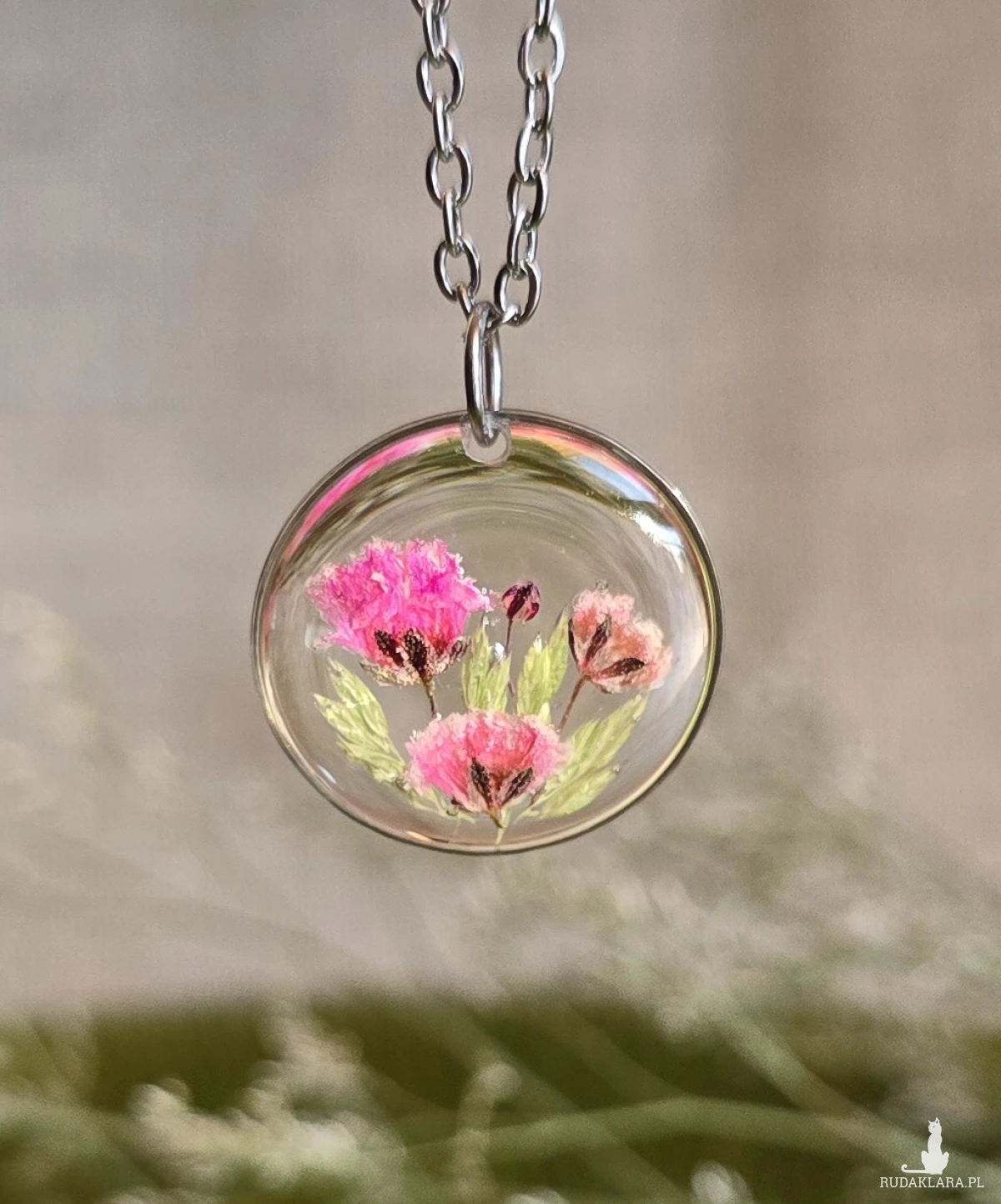 Oferuję Państwu unikalną biżuterię. Zawieszka jest wykonana z suszonych kwiatów i żywicy epoksydowej. Biżuteria jest wspaniałym i oryginalnym prezentem na lata.
