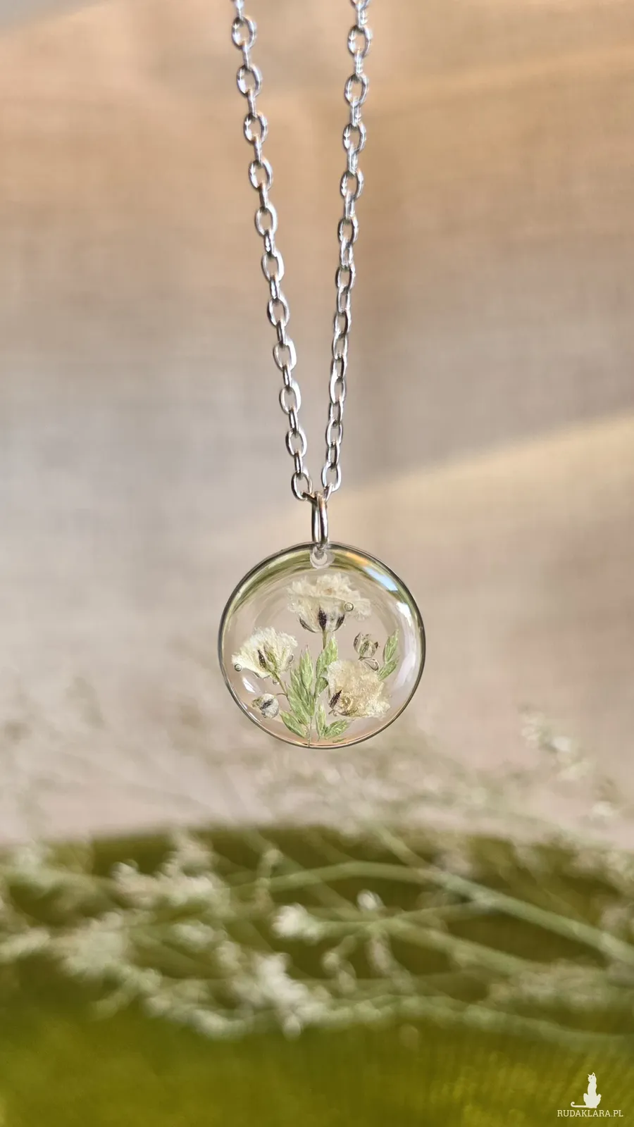 Oferuję Państwu unikalną biżuterię. Zawieszka jest wykonana z suszonych kwiatów i żywicy epoksydowej. Biżuteria jest wspaniałym i oryginalnym prezentem na lata.