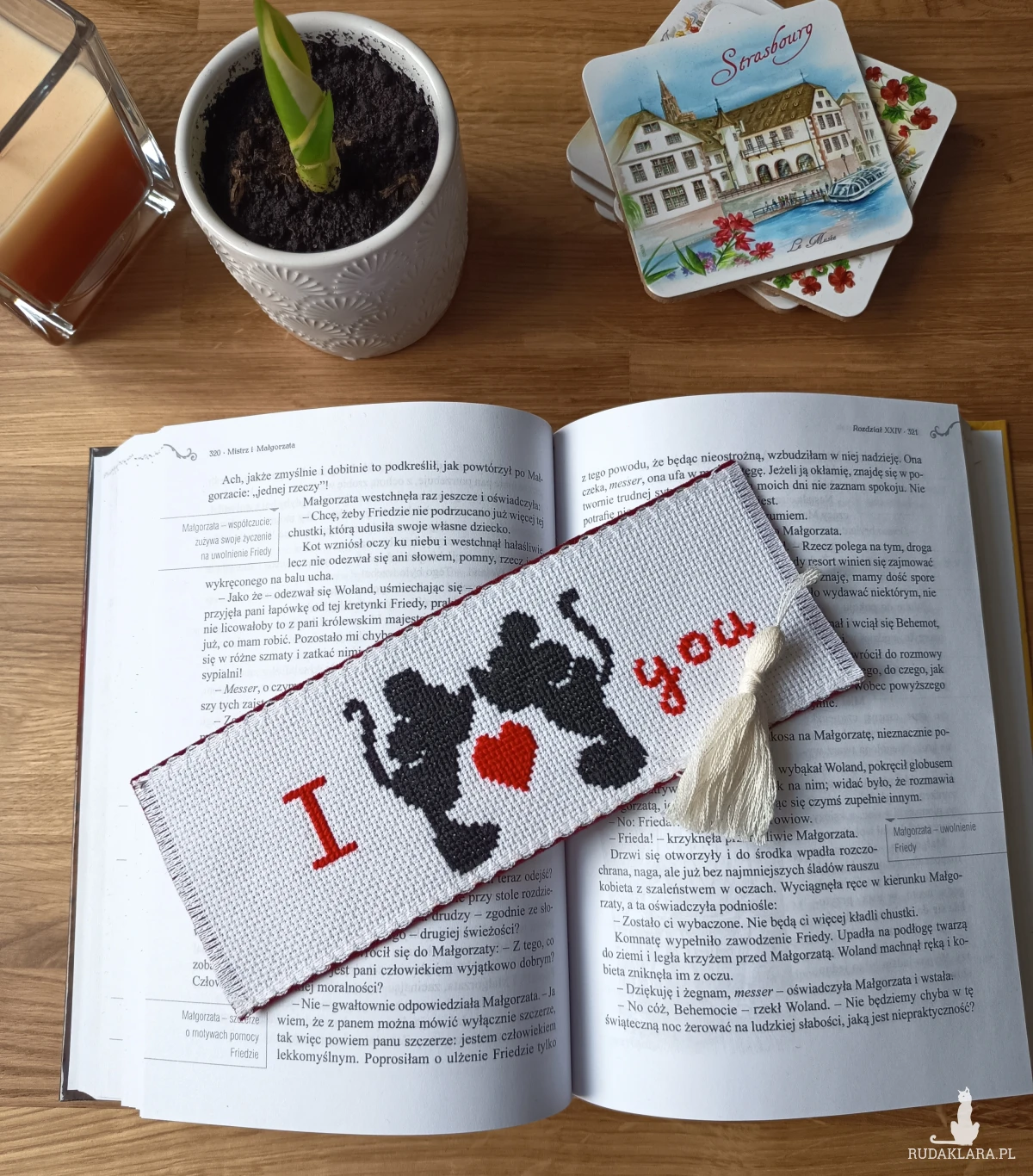 Unikatowa zakładka wykonana z dbałością o każdy detal. Wyszywana haftem krzyżykowym i starannie wykończona filcem, dzięki czemu jest trwała i przyjemna w użytkowaniu.