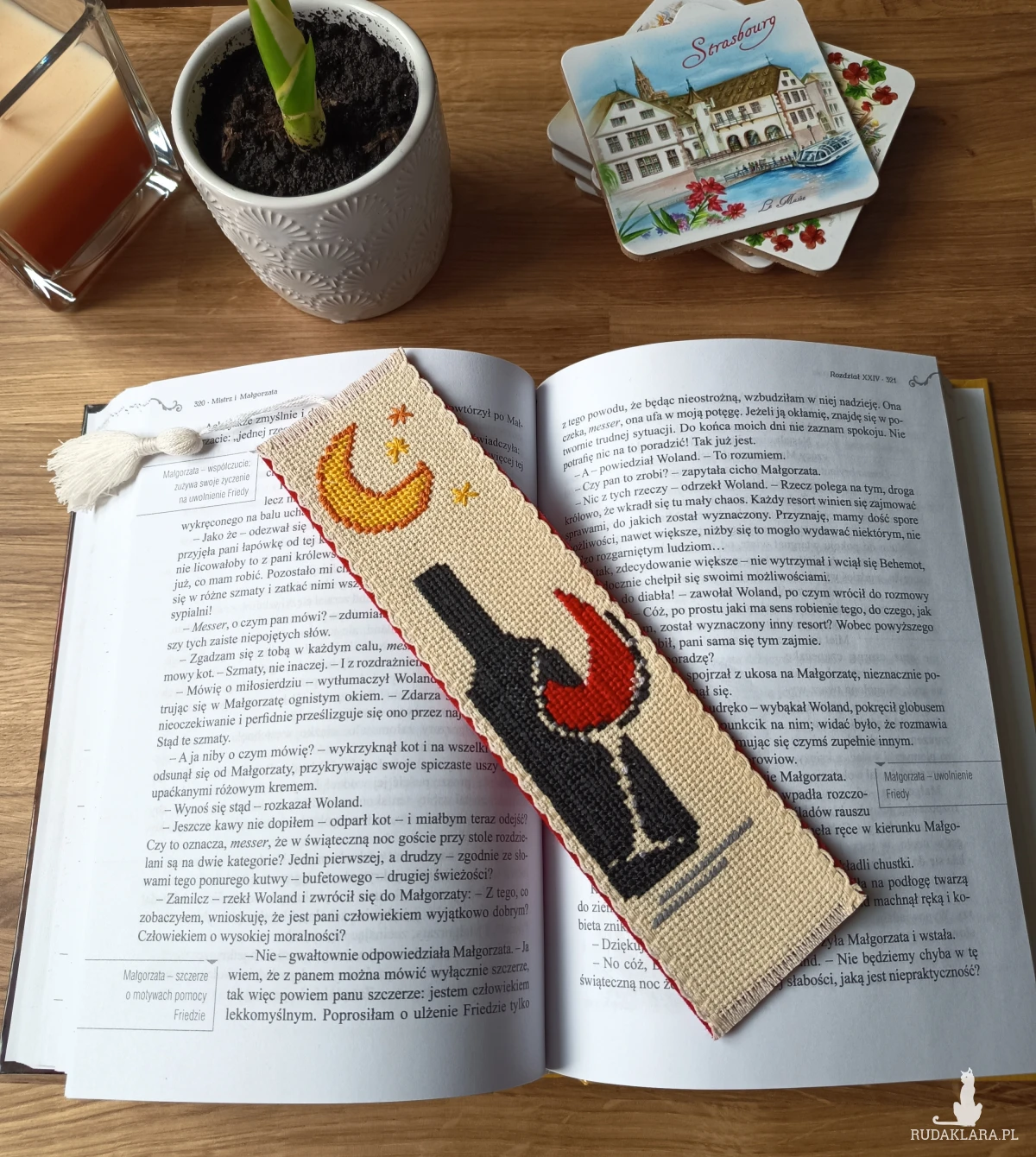 Unikatowa zakładka wykonana z dbałością o każdy detal. Wyszywana haftem krzyżykowym i starannie wykończona filcem, dzięki czemu jest trwała i przyjemna w użytkowaniu.