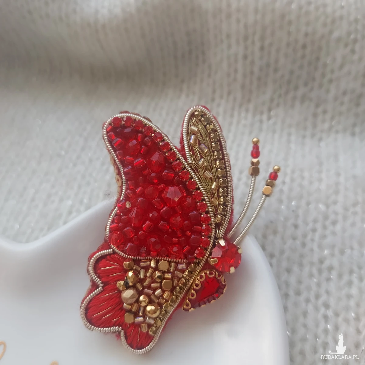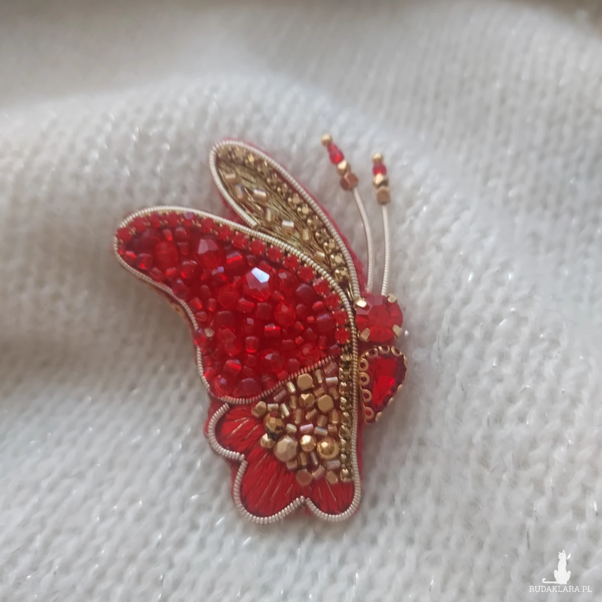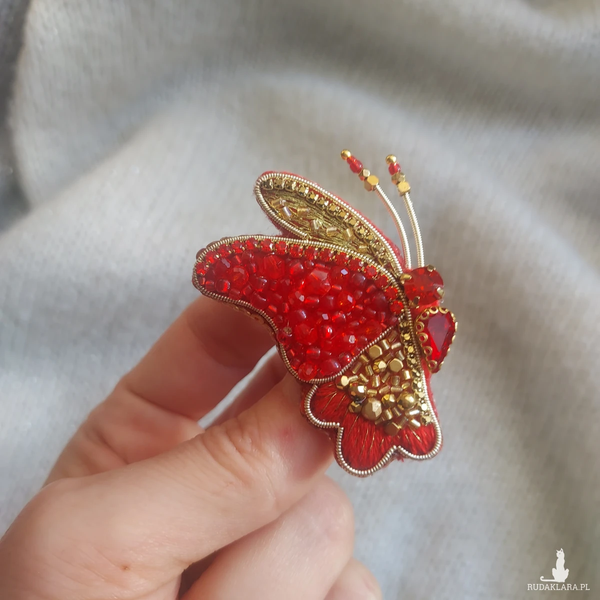 Jeśli tak, to mam dla Ciebie wyjątkową, kolorową broszkę MOTYLA w przepięknym kolorze czerwieni i złota. Powstała z dbałością o szczególy haftem koralikowym oraz płaskim.