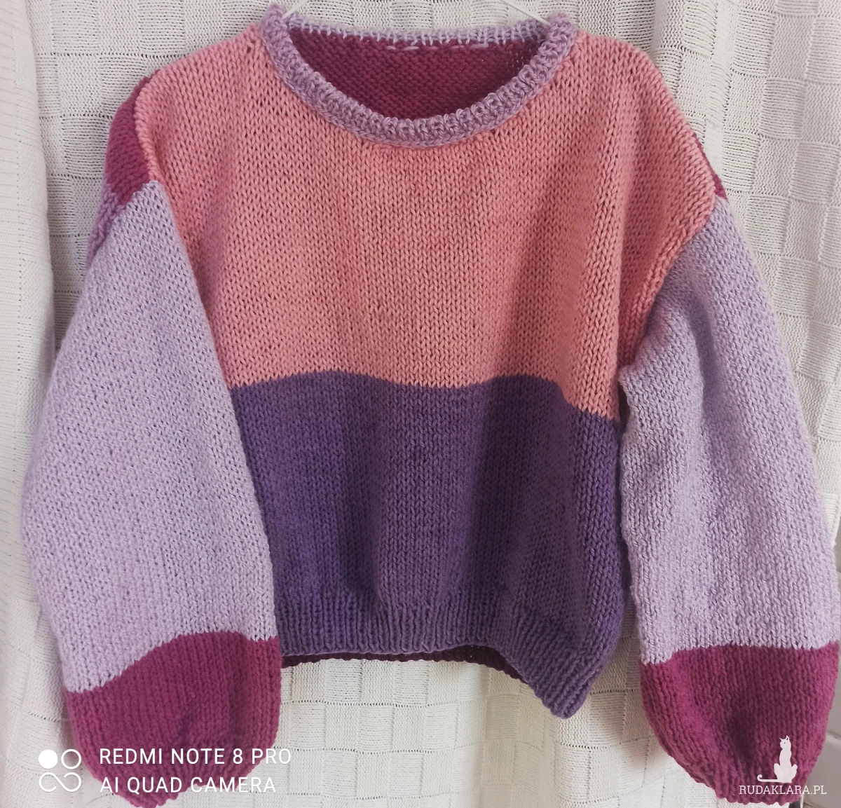 Sweter pod szyję kolorowy oversize z długimi szerokimi rękawami. Średnio gruby. Bardzo lekki, wykonany ręcznie na drutach. Wykonany z włóczki z poliamidem w różnej kolorystyce, w motku kolory sukcesywnie się zmieniają. Przód różowo-śliwkowy, tył burgund i fioletowy, rękawy burgund i jasny fiolet. Pliska przy szyi luźna, swobodnie otacza szyję. Całość wykonana oczkami prawymi. Ściągacze i pliska swetra wykonane ściegiem ściągaczowym oczko lewe, oczko prawe. Jest niezwykle miły w dotyku, nie drapie. Przewiewny ale ciepły, krótki i szeroki. Można nosić bez koszulki. Świetna propozycja dla nastolatek. Opadające ramiona przedłużają długość rękawa. Rękawy dosyć szerokie i długie. Wspaniały look do spódnicy i spodni, stanowi elegancką kompozycję. W rzeczywistości wygląda zdecydowanie lepiej. Pranie ręczne w kąpieli do 30 stopni.