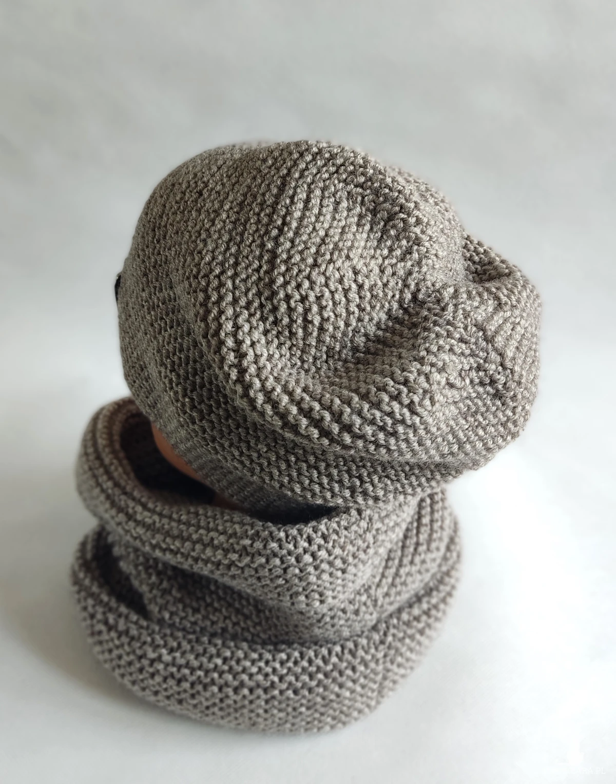 W skład zestawu wchodzi komin, golfik, tuba i czapka o klasycznym fasonie, robiona ściegiem francuskim, dopasowująca się do kształtu głowy.