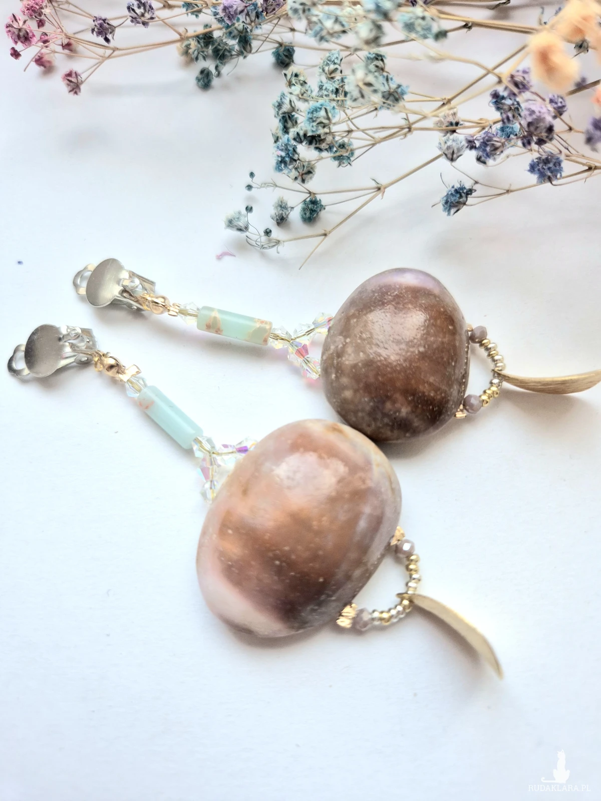 Klipsy masa Perłowa i drewno plus koraliki i minerały box x1